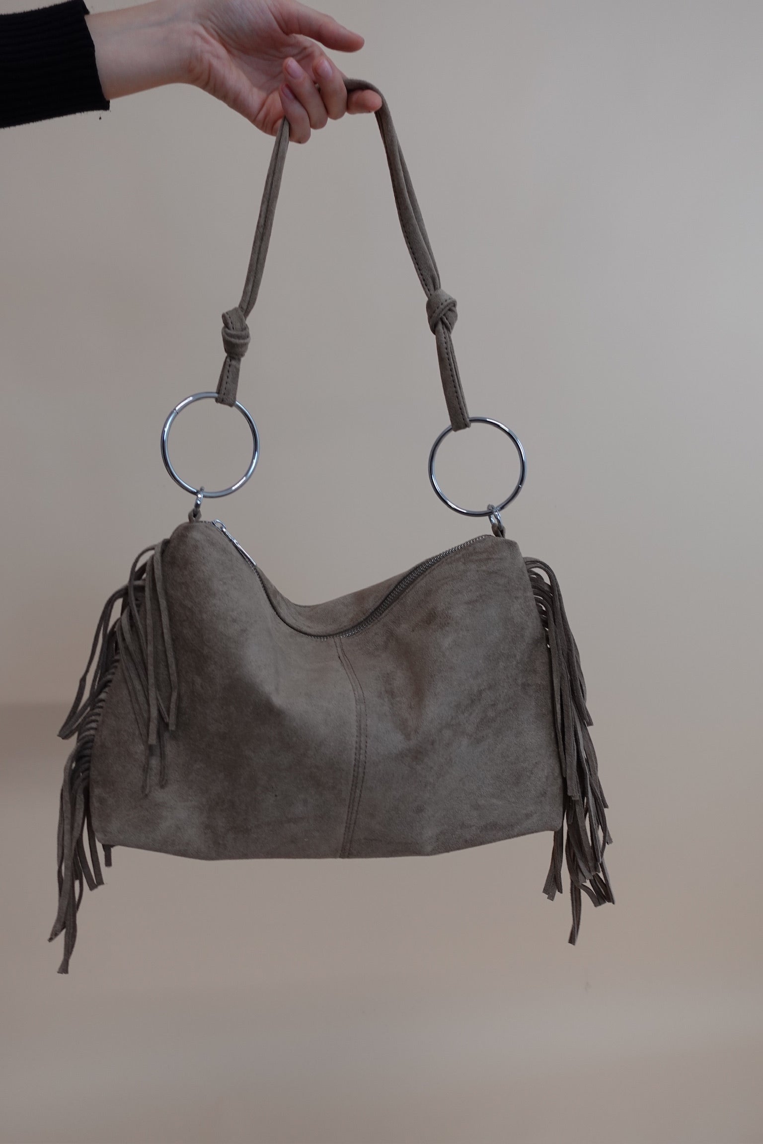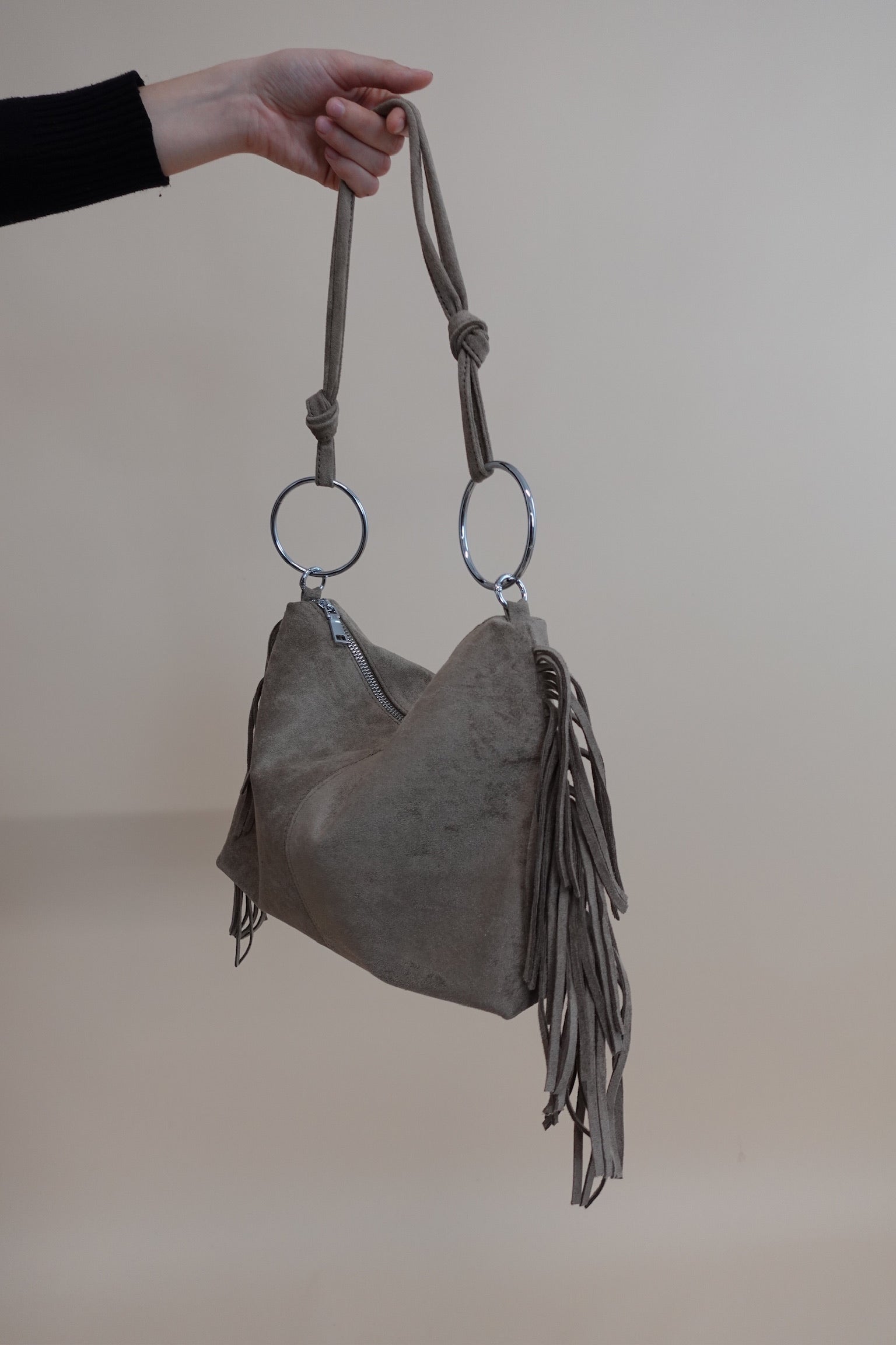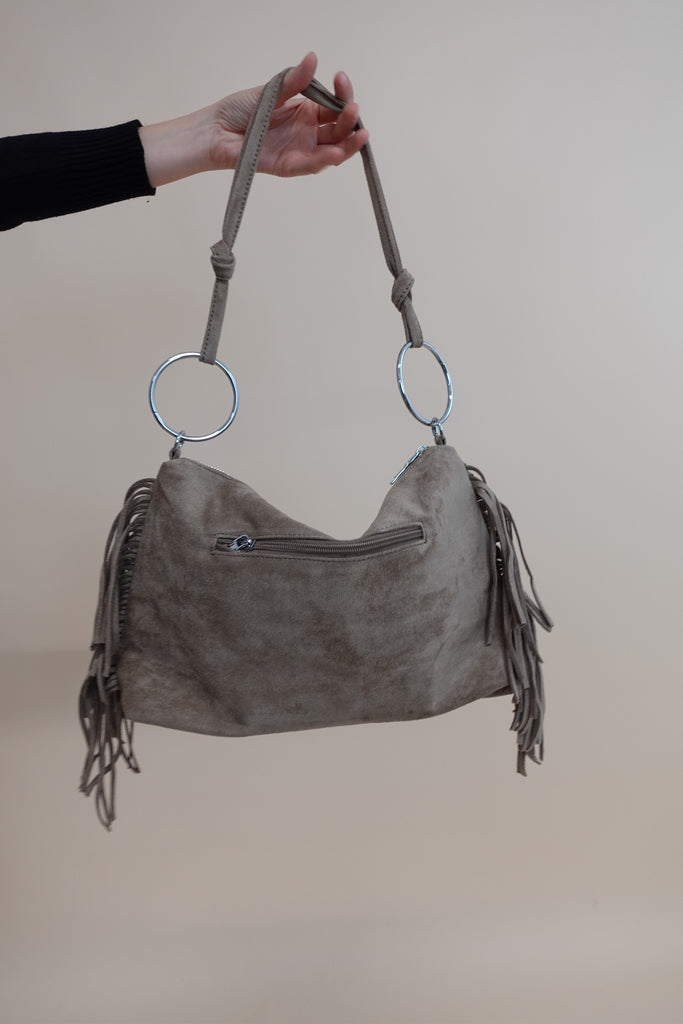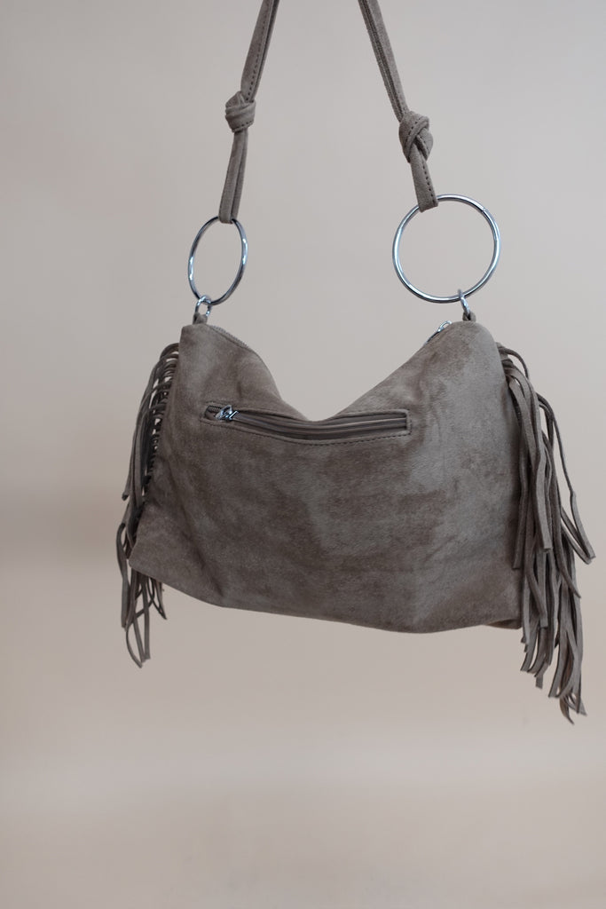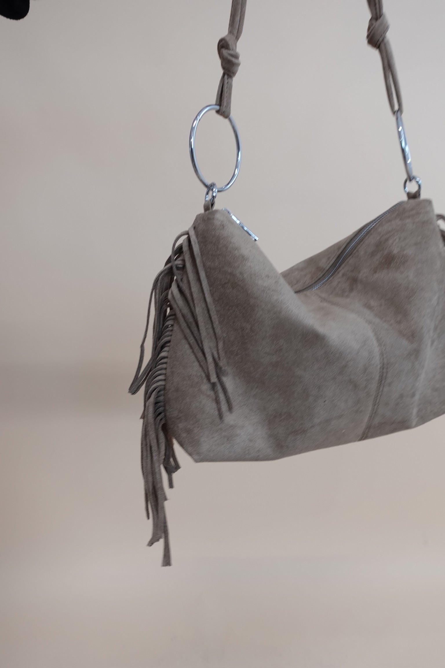Borsa scamosciata con frange e tracolla aggiuntiva