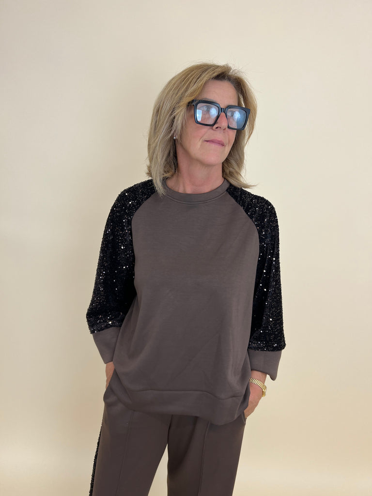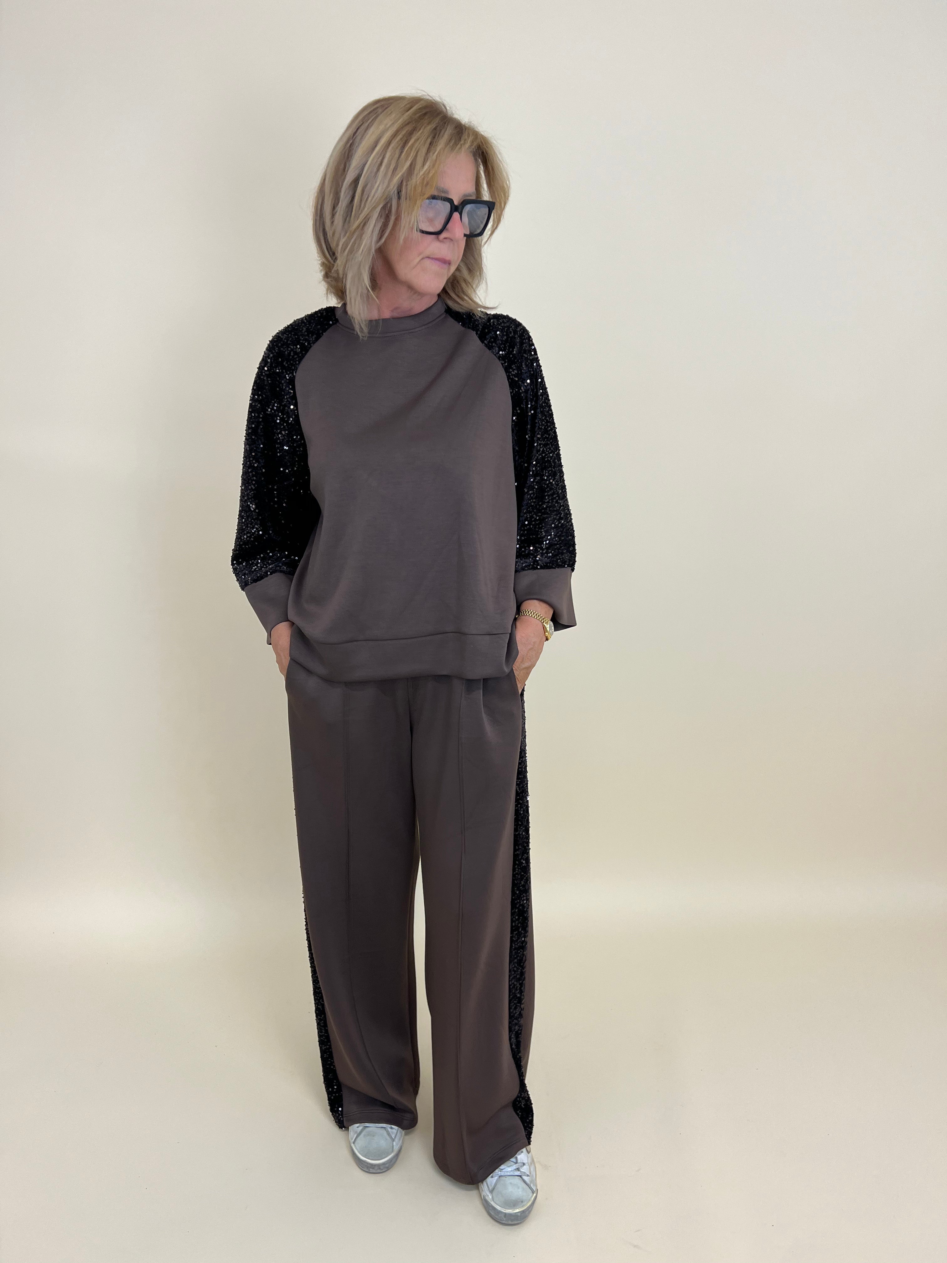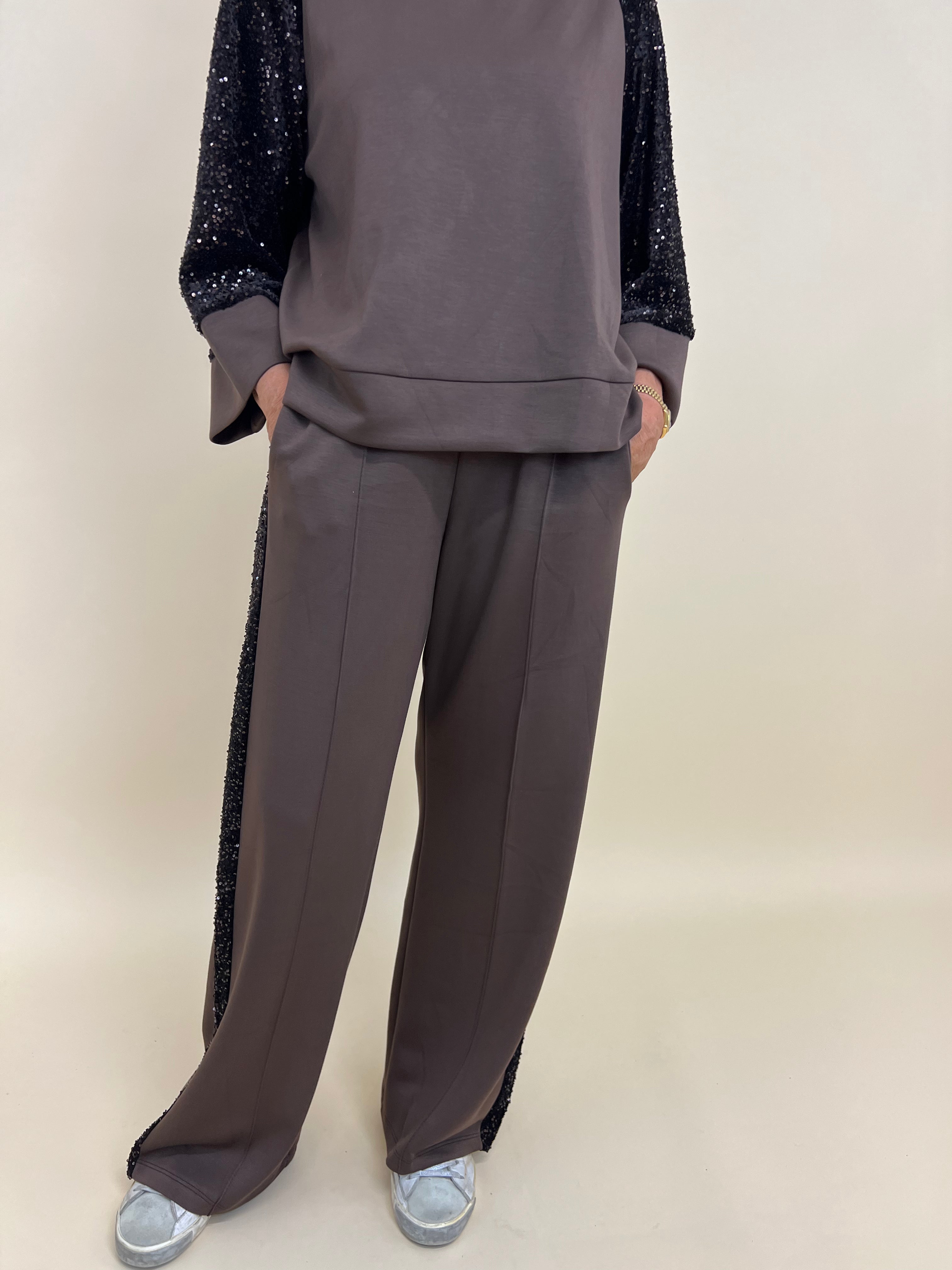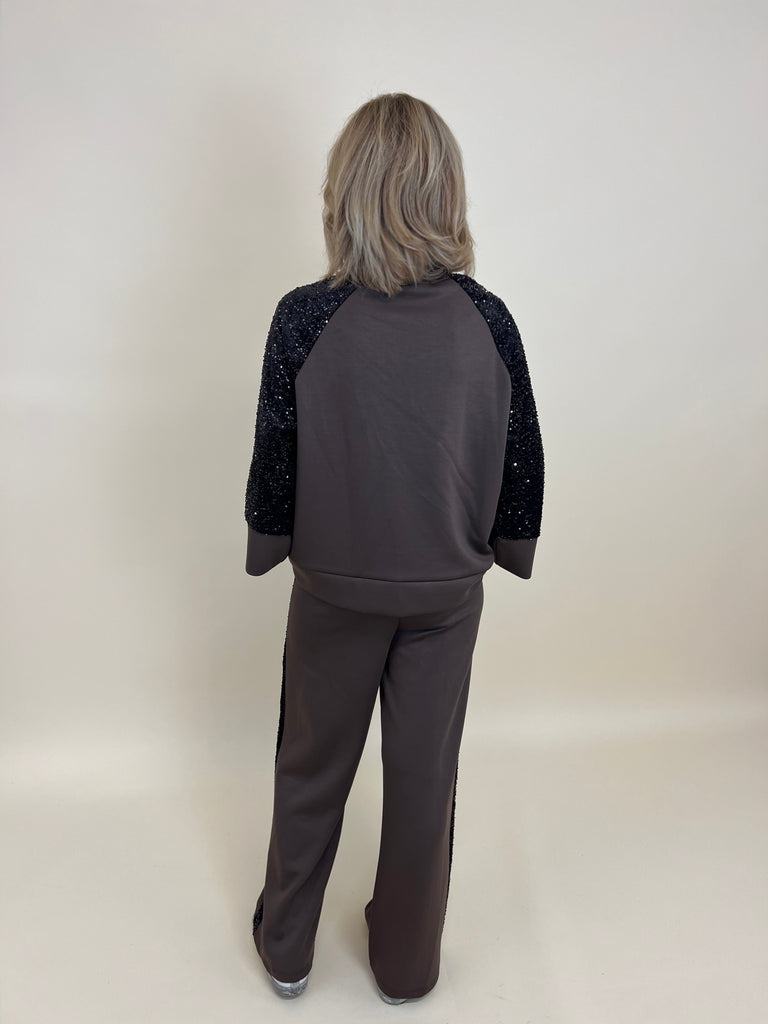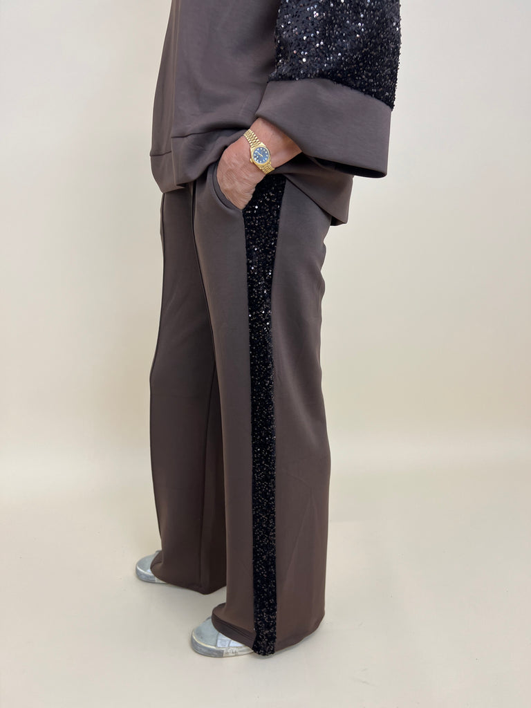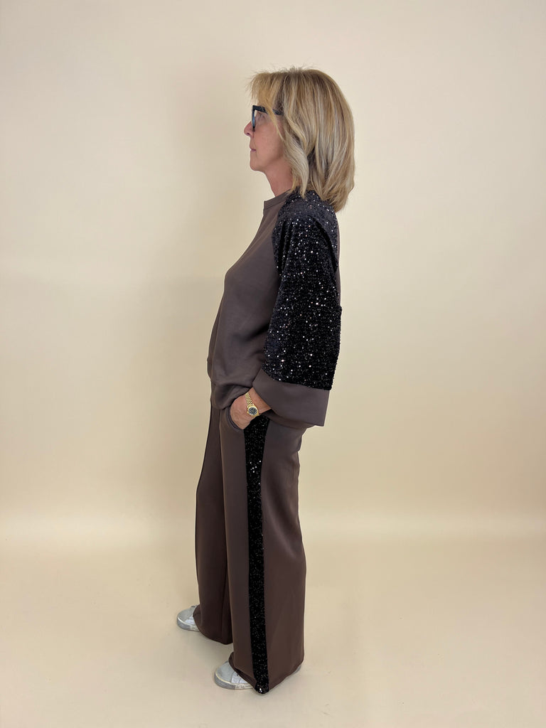 Tuta in misto viscosa con particolare sulle maniche e fascia sul pantalone di paiettes in tinta