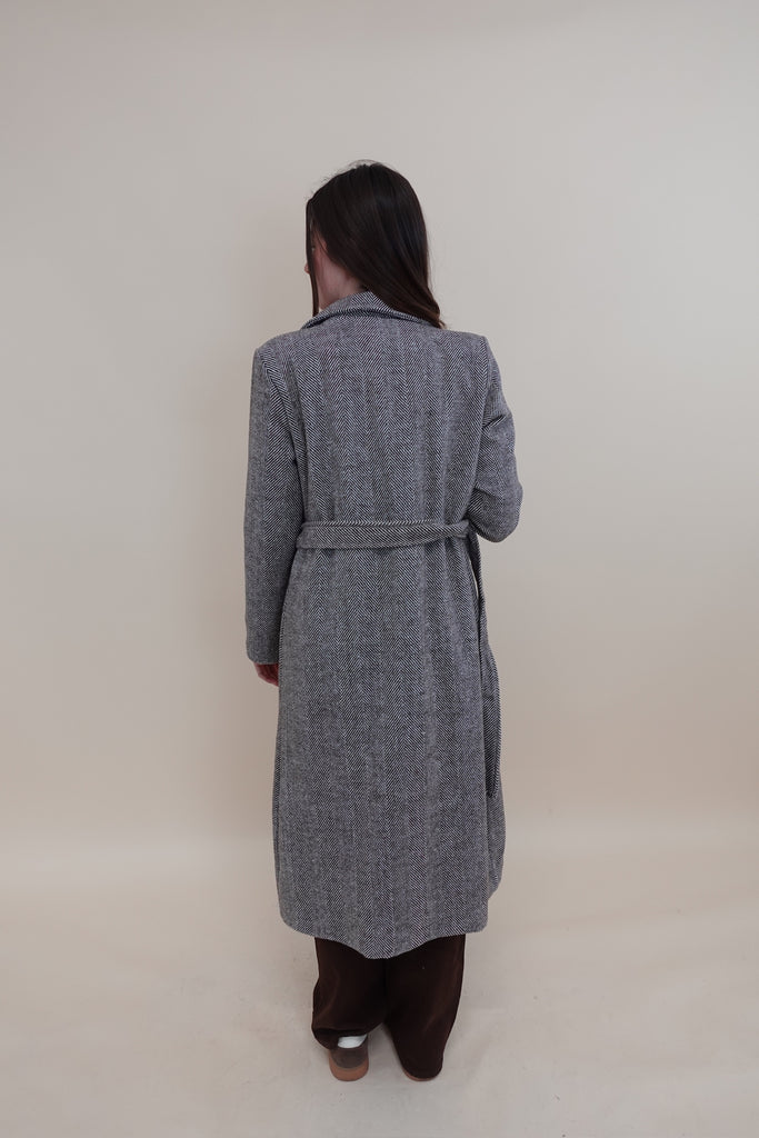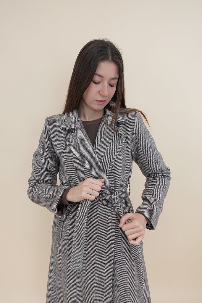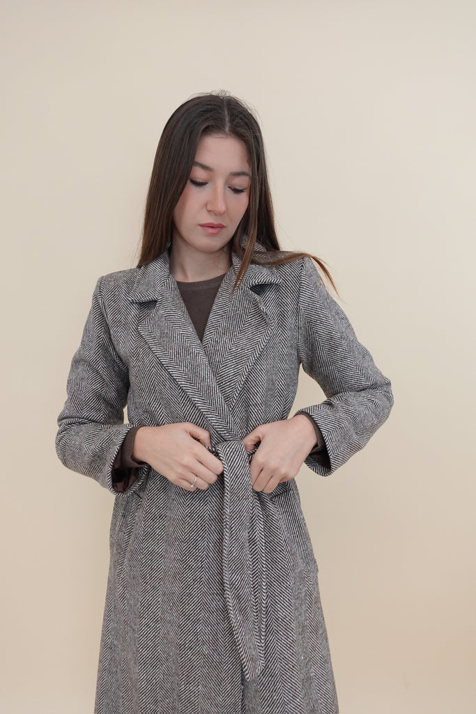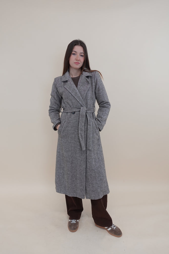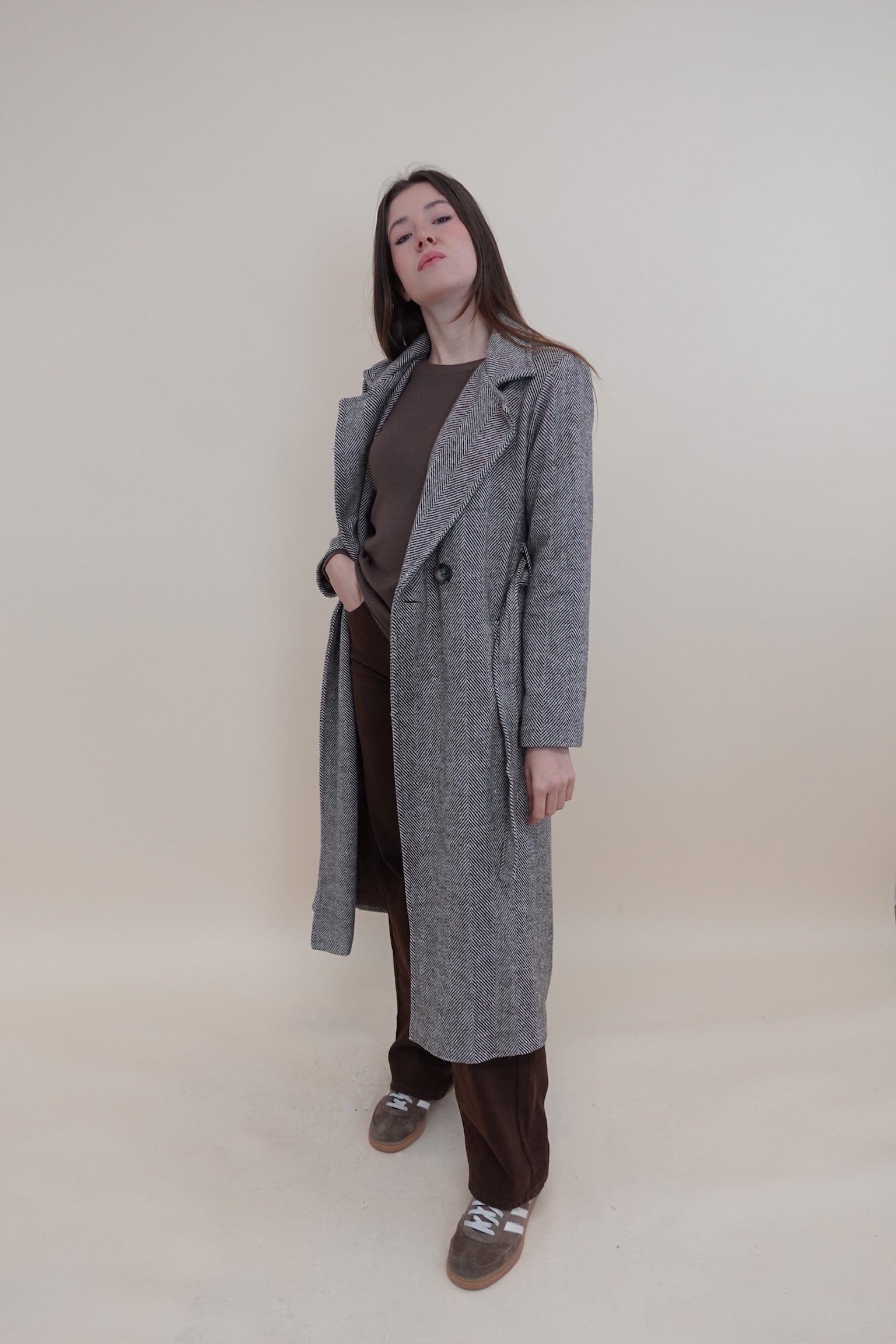 Cappotto lungo foderato con cintura, tasche e bottone frontale
