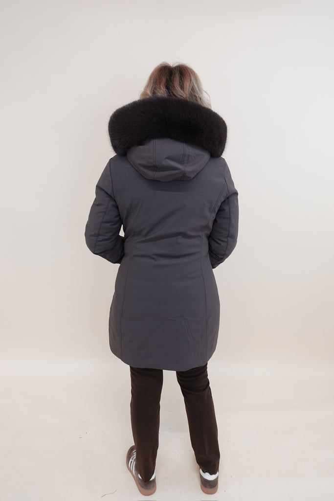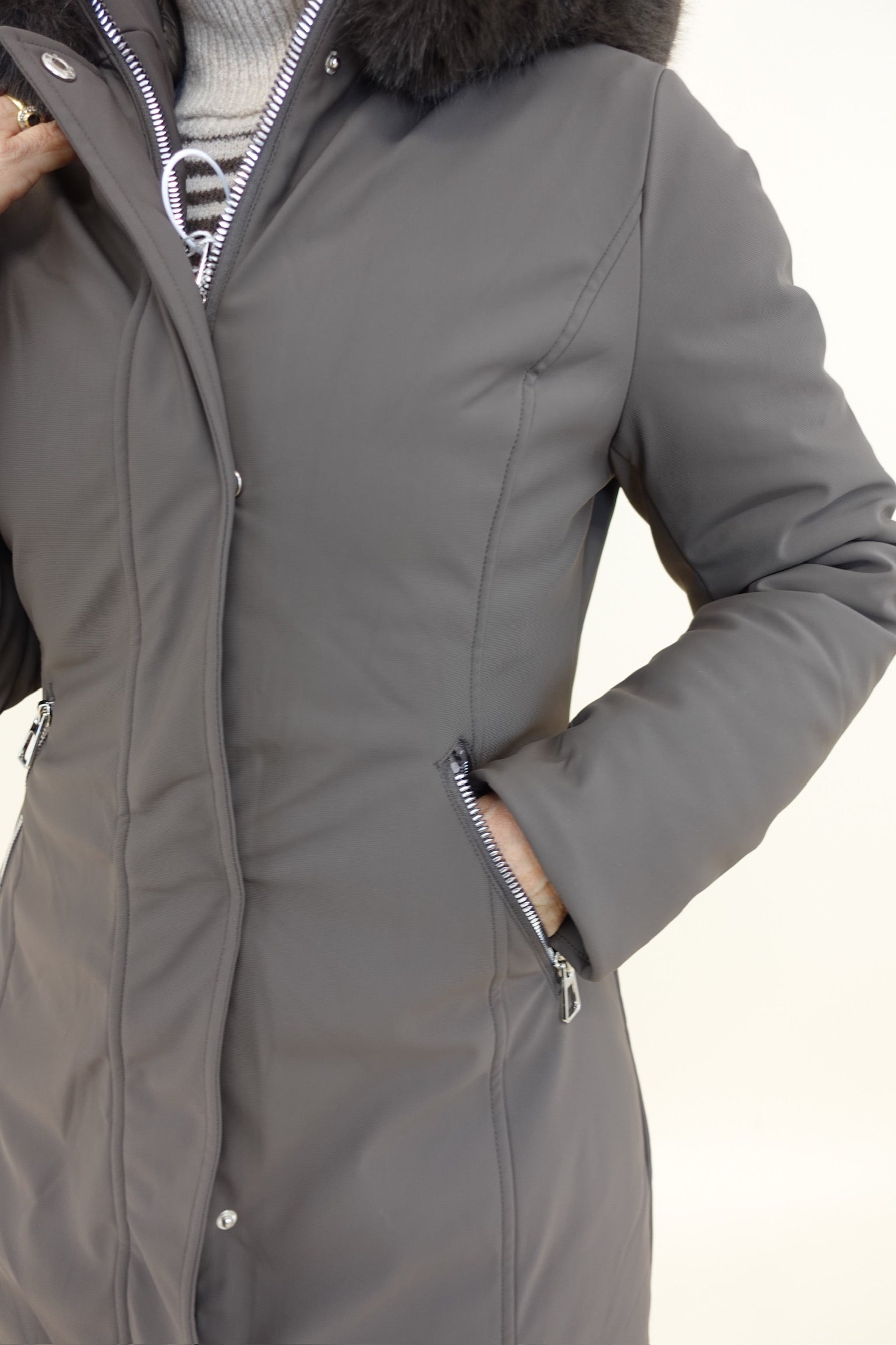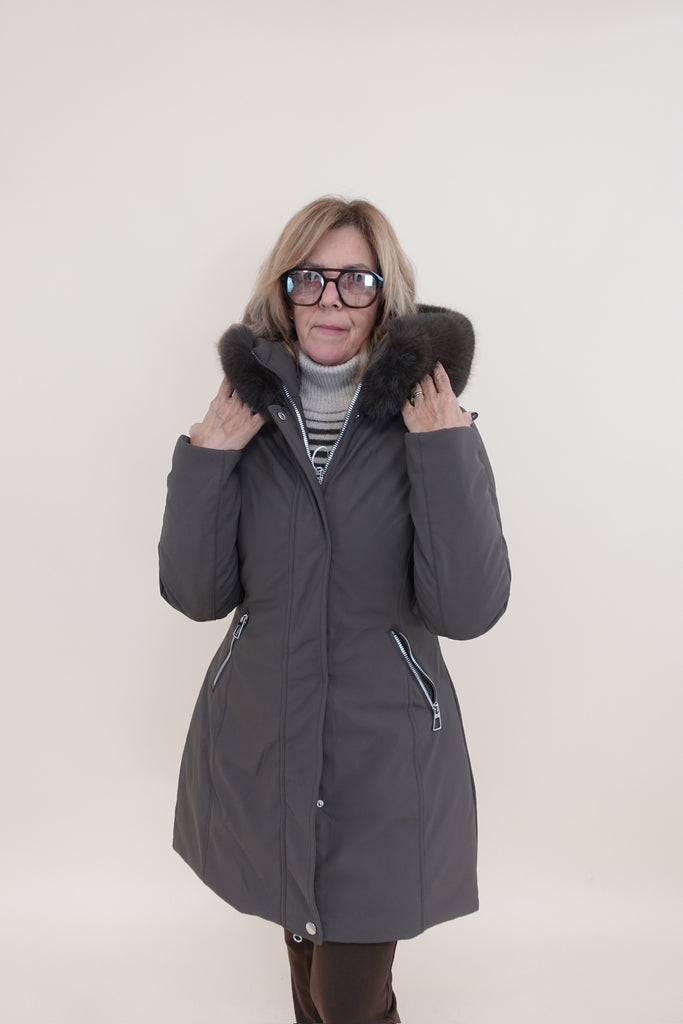 Piumino sfiancato con tasche laterali, cappuccio e chiusura con zip e bottoni