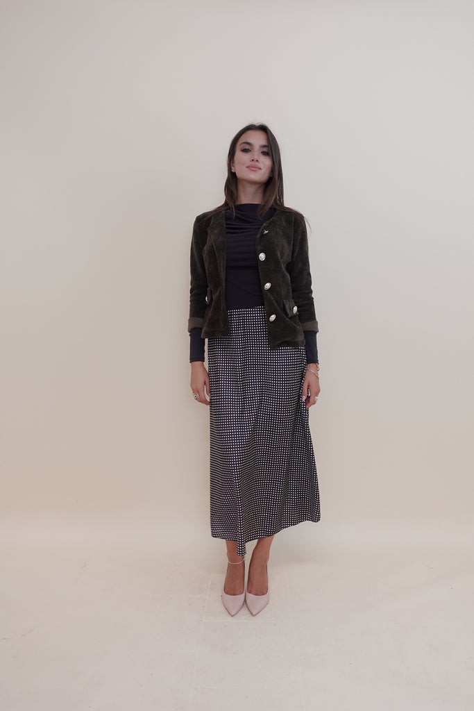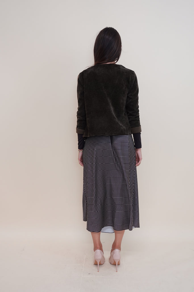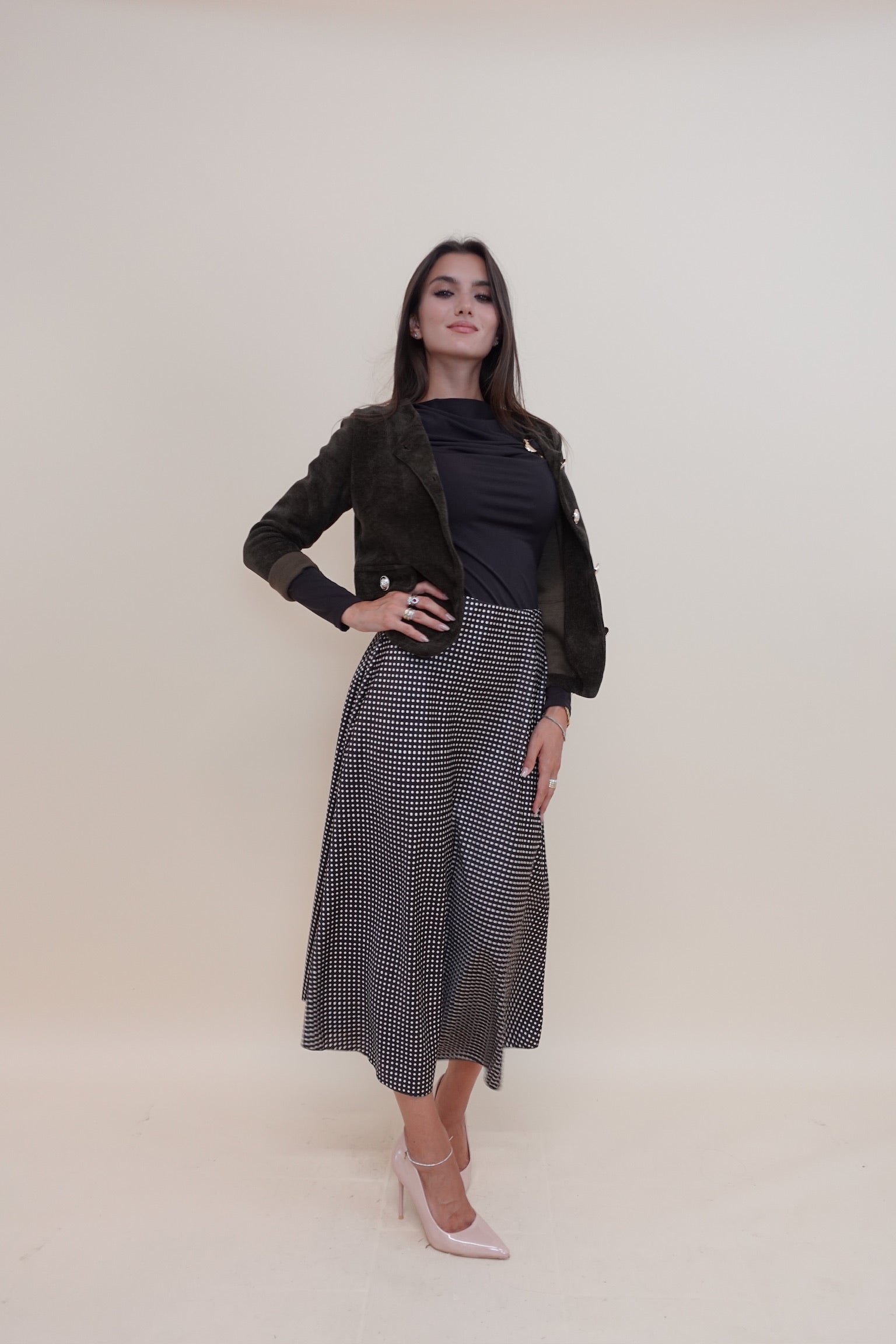 Gonna in effetto raso, con sfondo marrone e pois beige