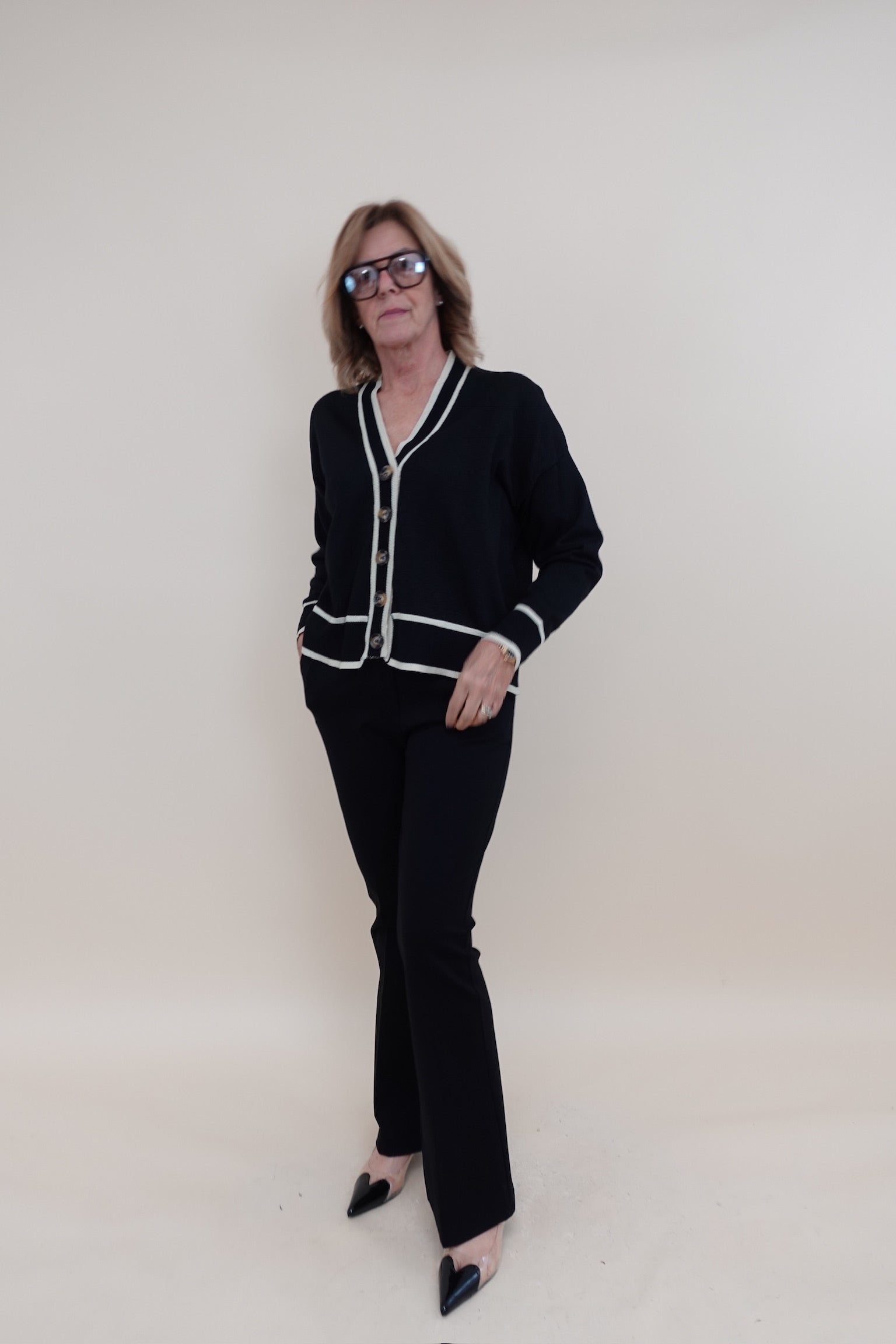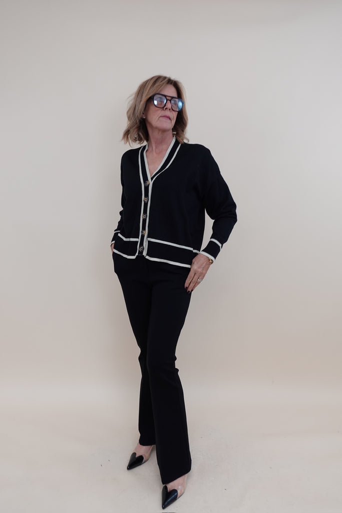 Cardigan con scollo a v, bottoni sul davanti e lavorazione dorata
