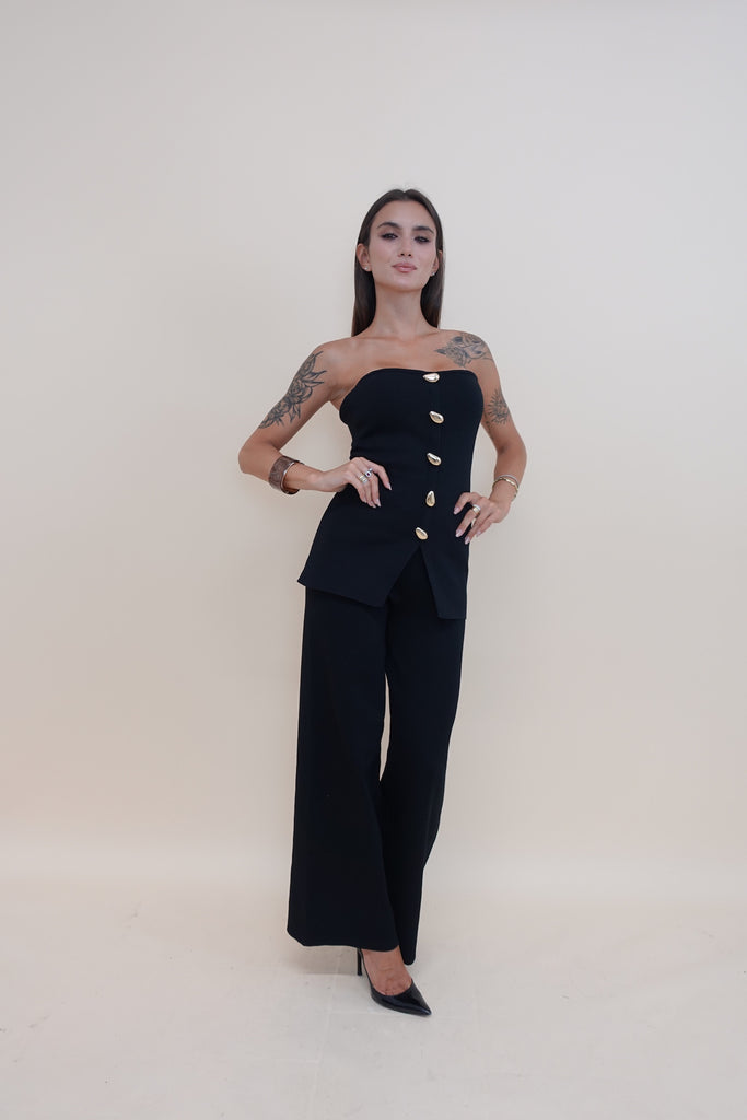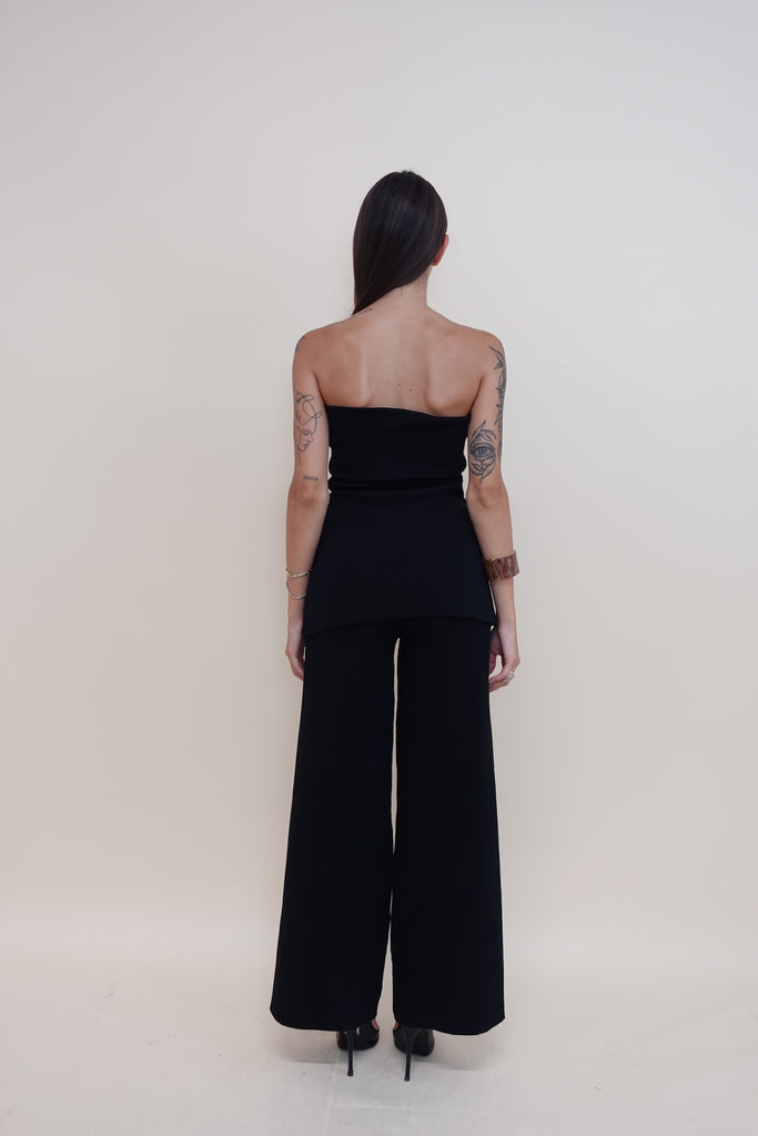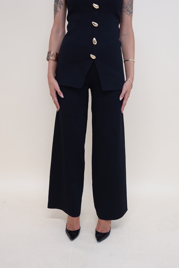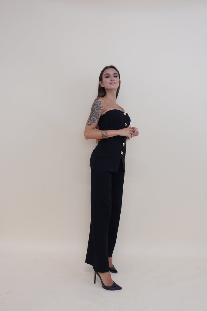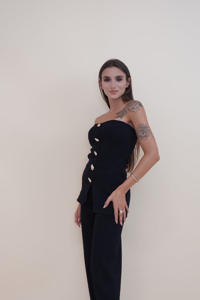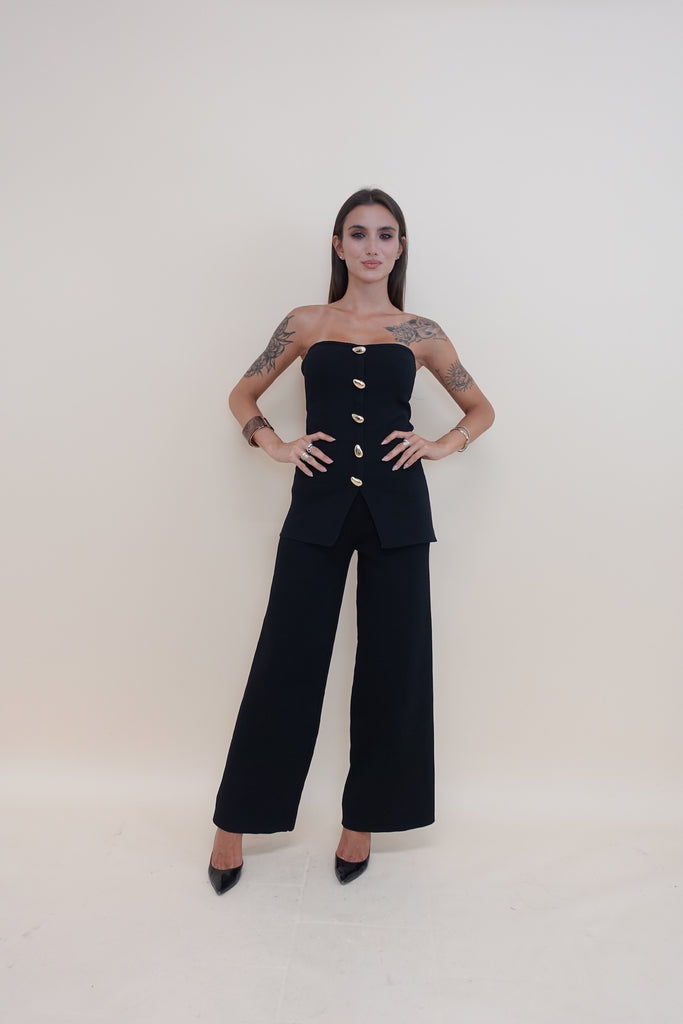 Completo in maglia composto da top a fascia con bottoncini gioiello e pantalone a palazzo elasticizzato