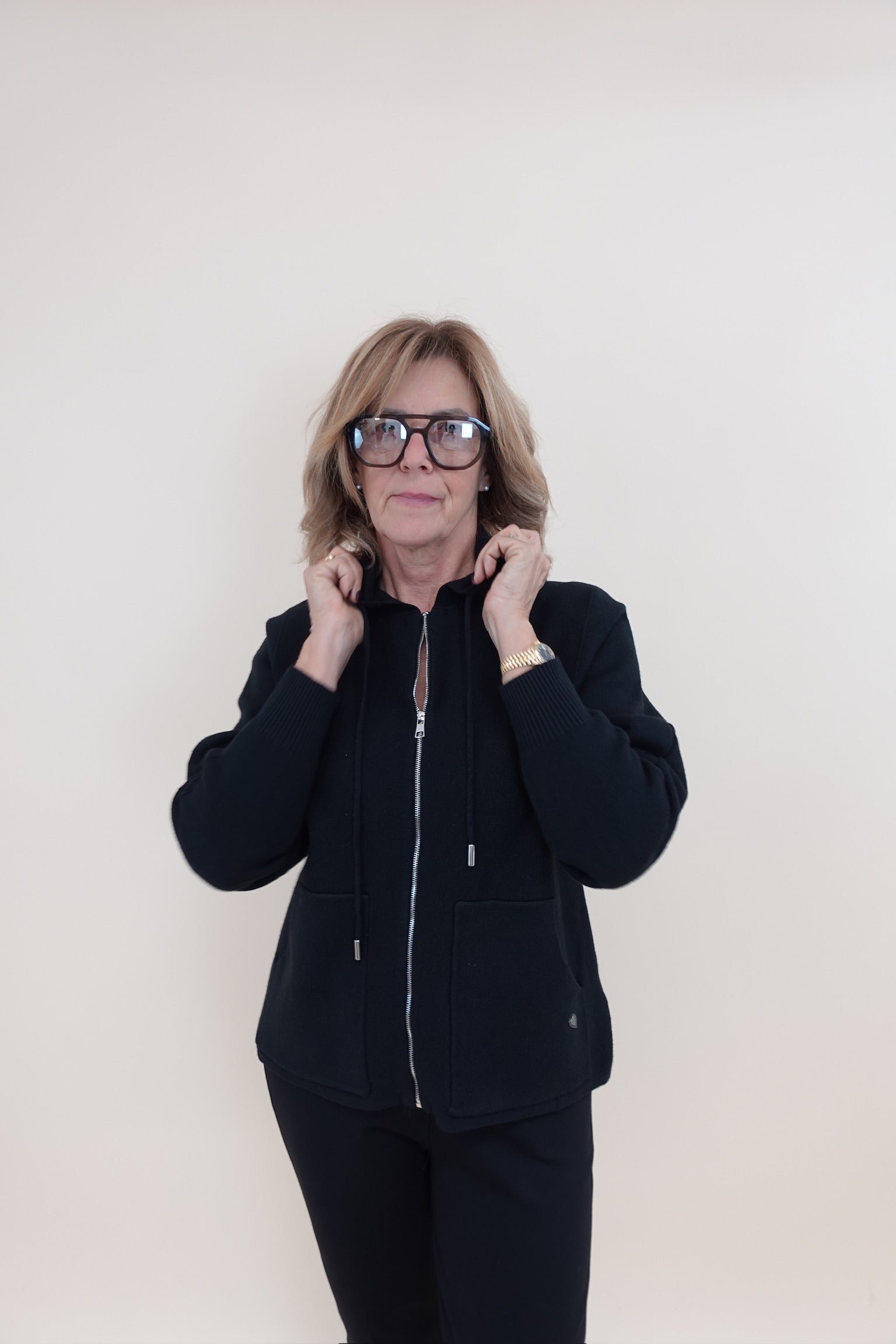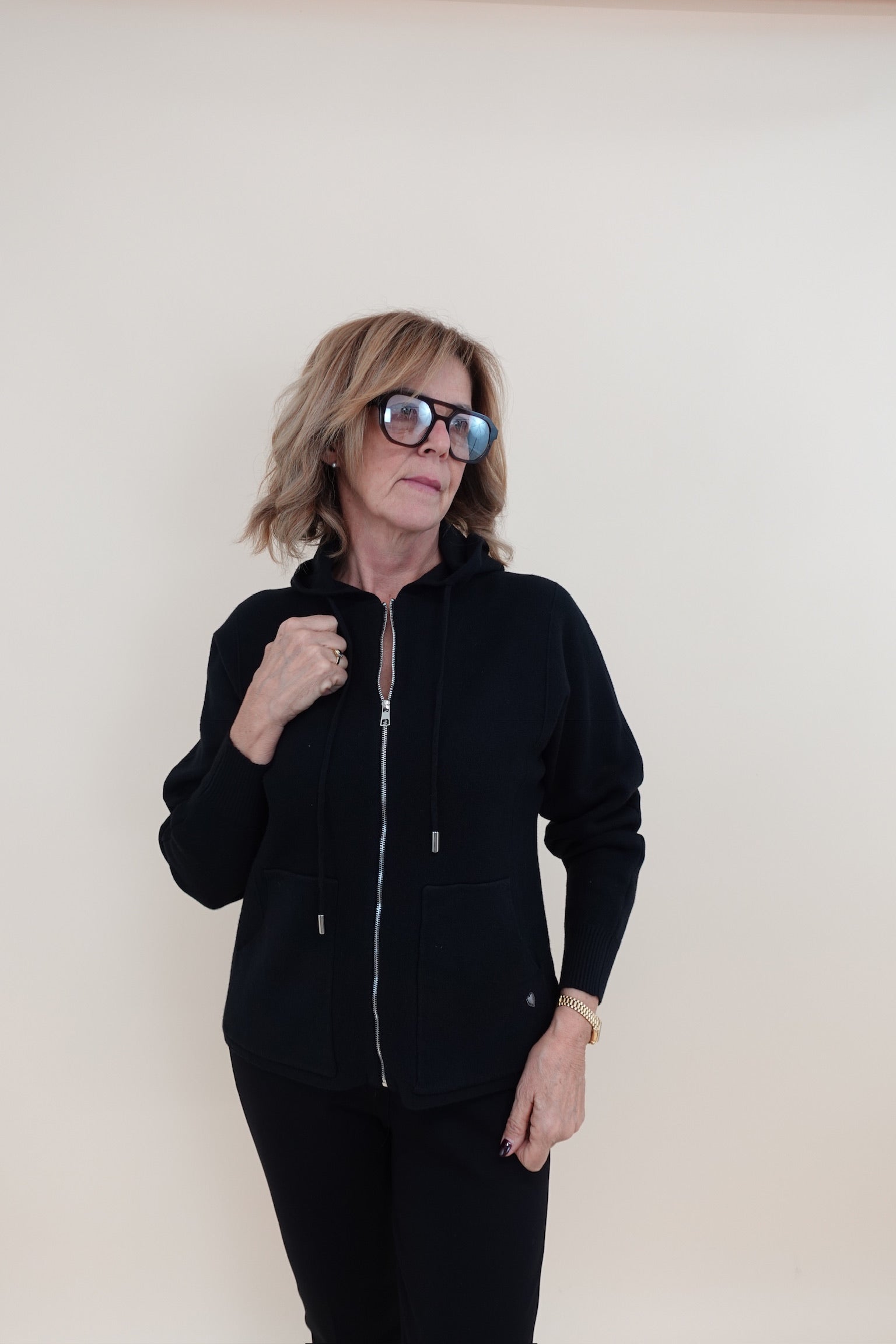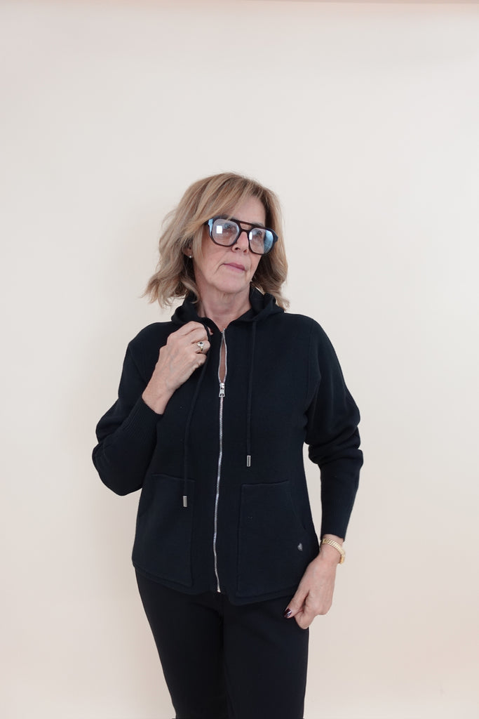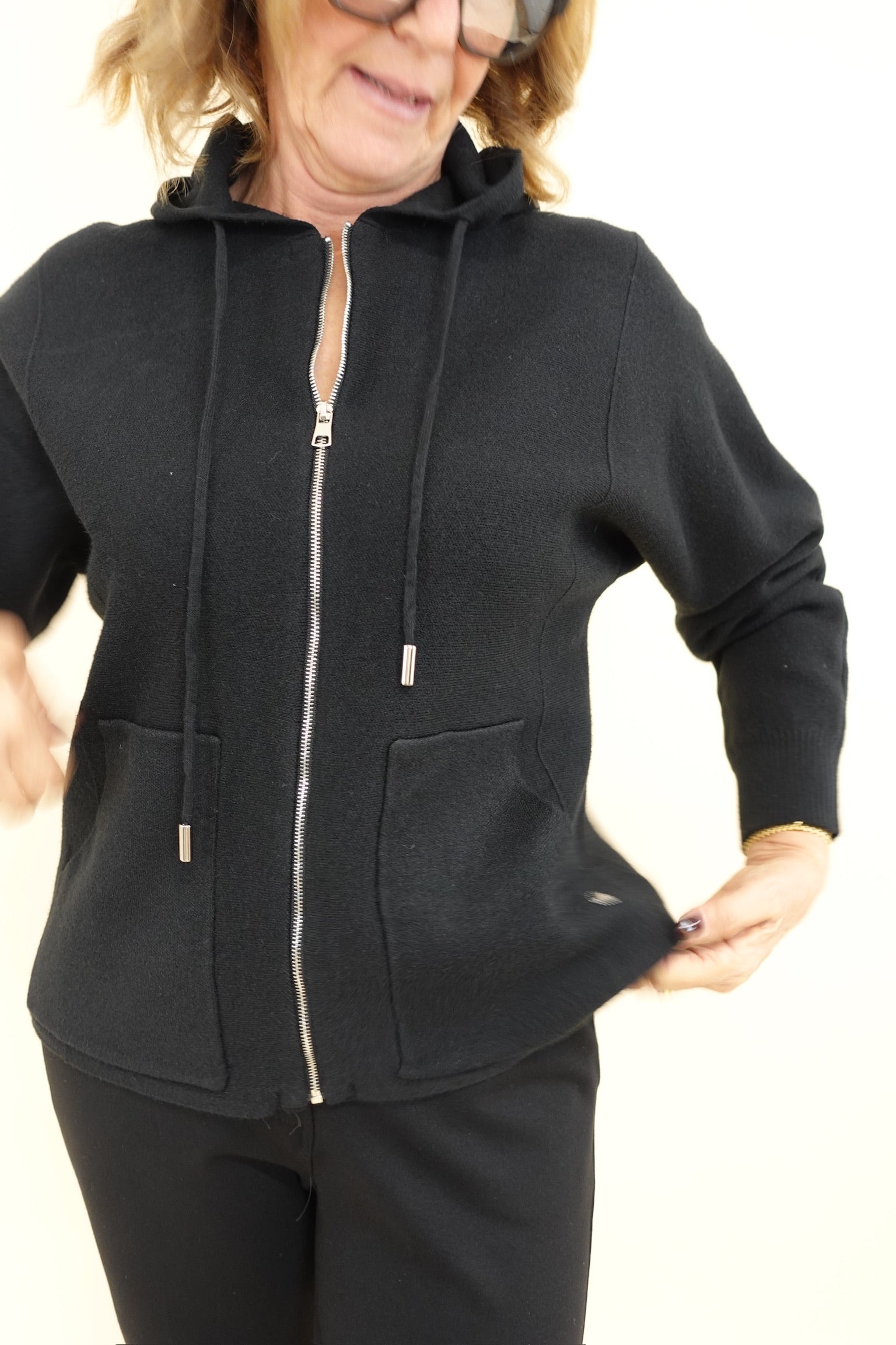 Felpa in tessuto tipo maglia, con zip, tasche e cappuccio