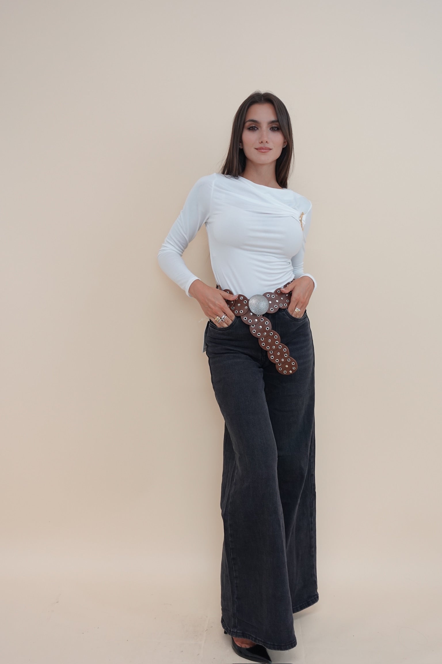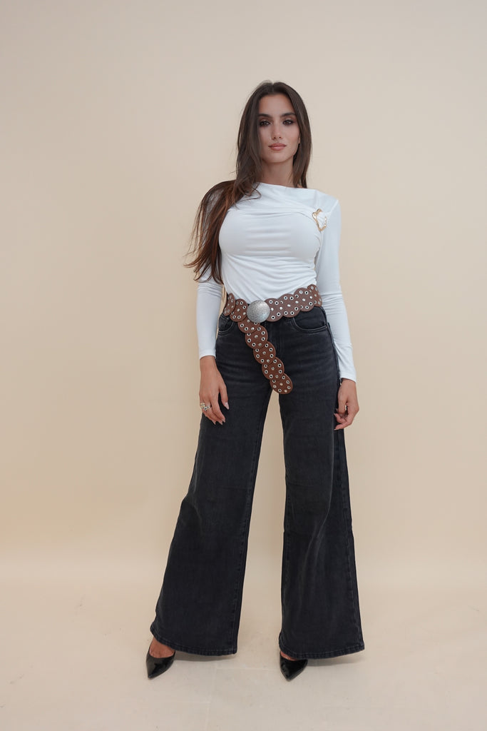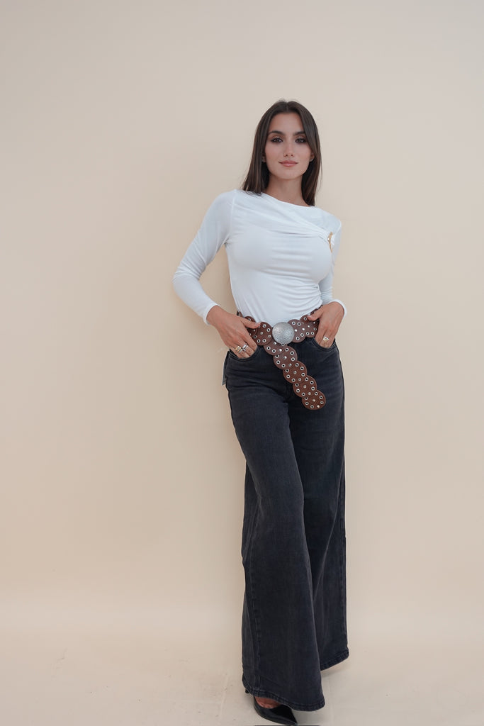 Maglia con maniche lunghe, drappeggio sul davanti e fermaglio dorato