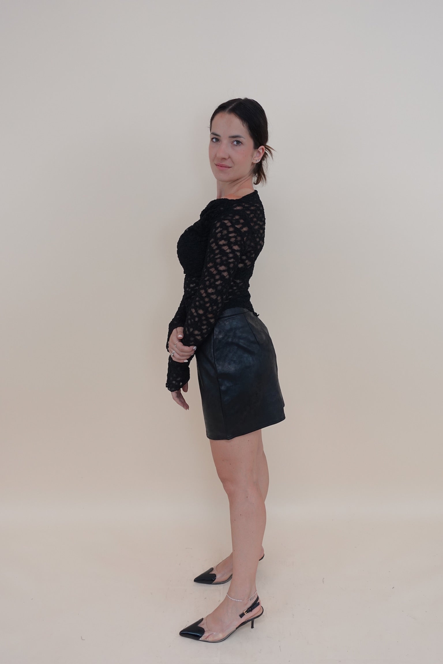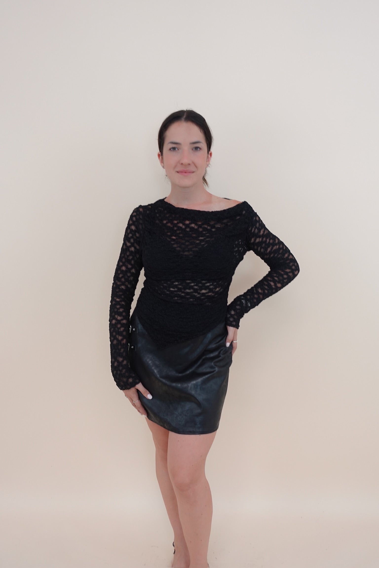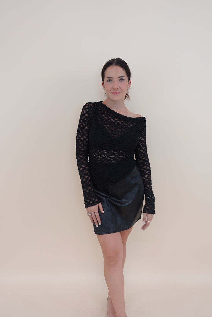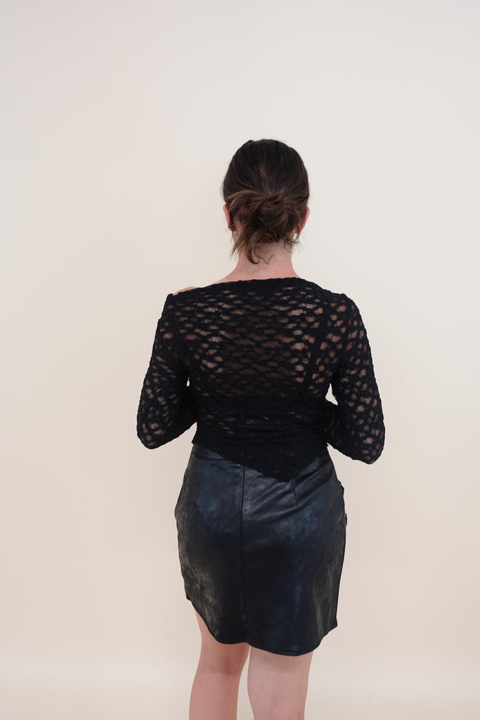 Maglia in pizzo velata con scollo obliquo e manica lunga