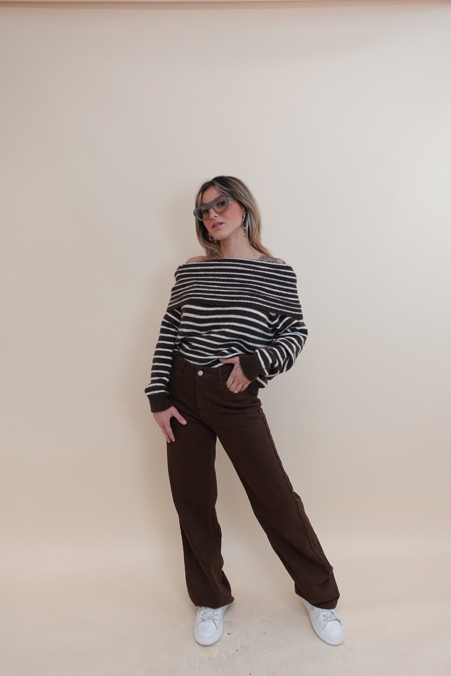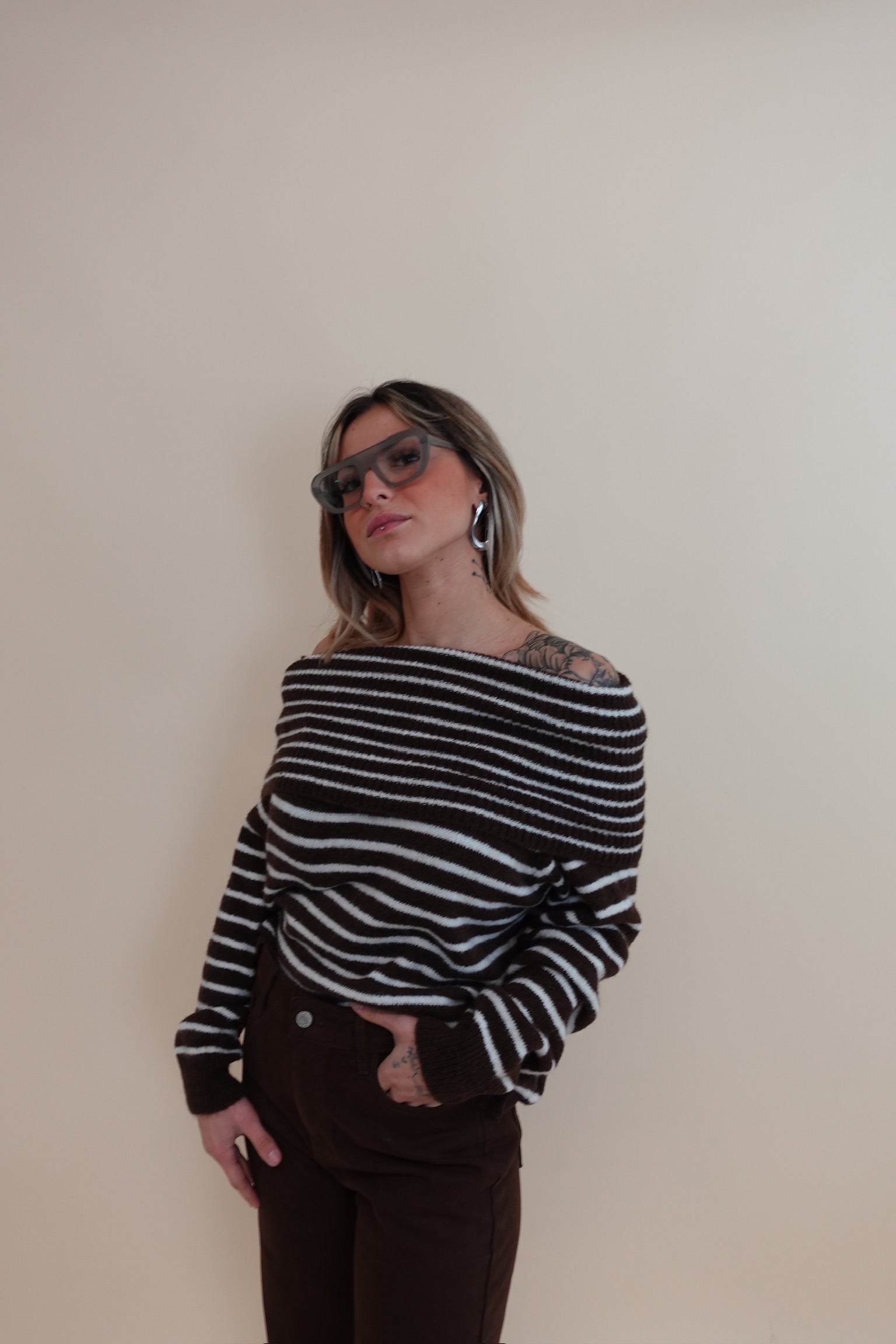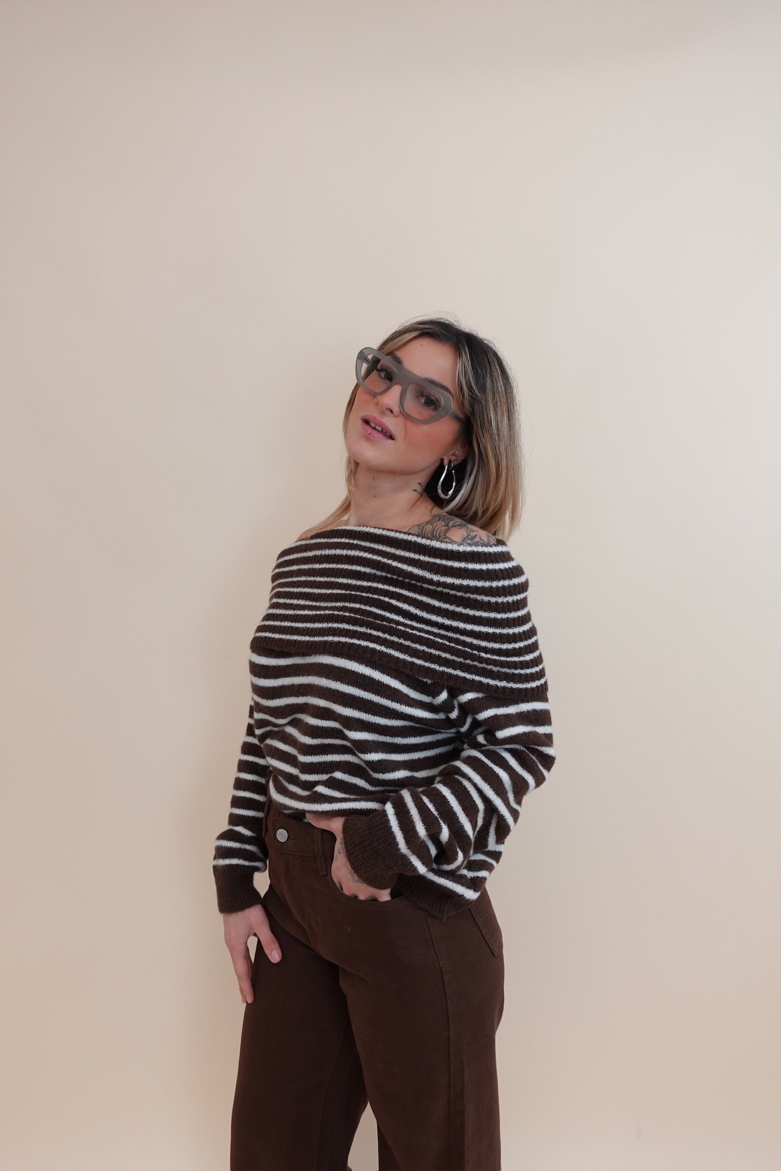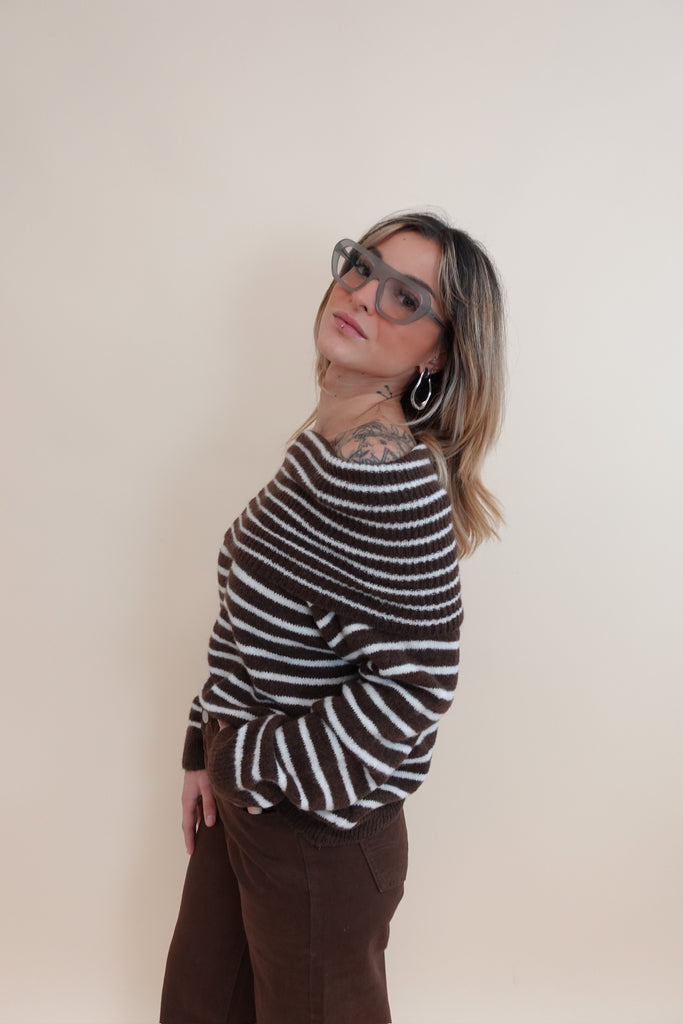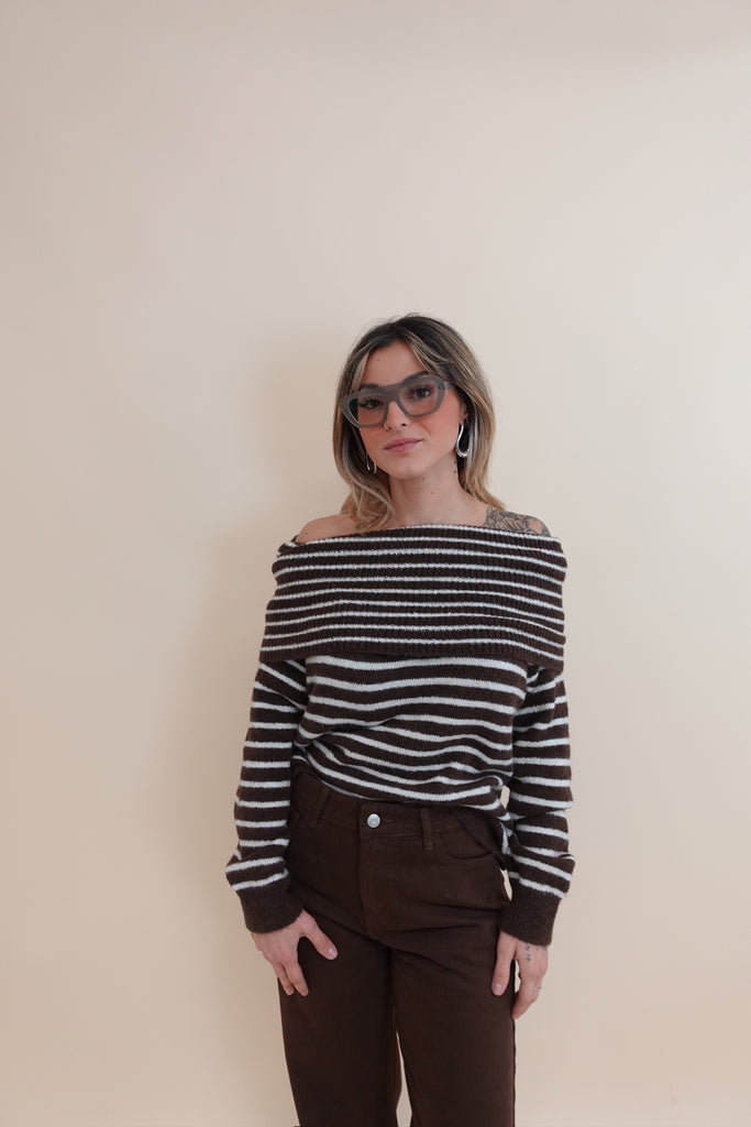 Maglione con scollo sceso, a righe