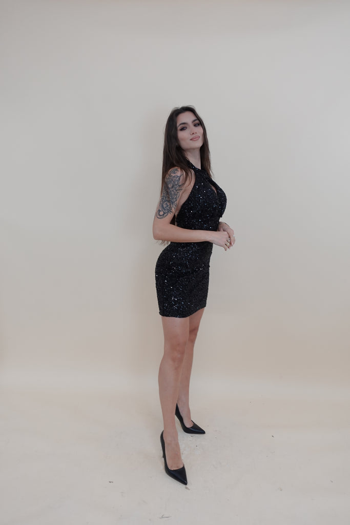 Abito paiettato smanicato, con coppe preformate e allacciatura sul collo