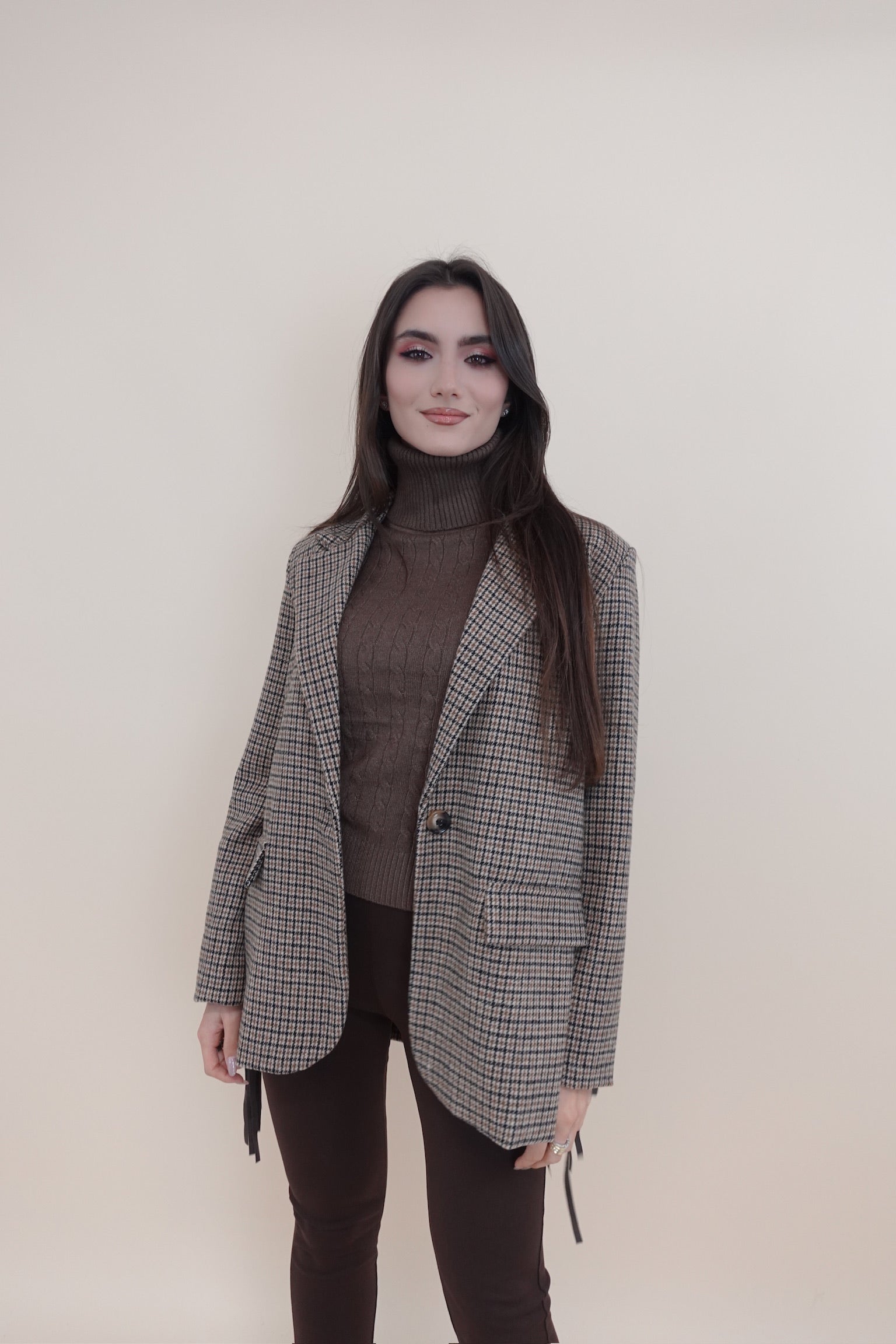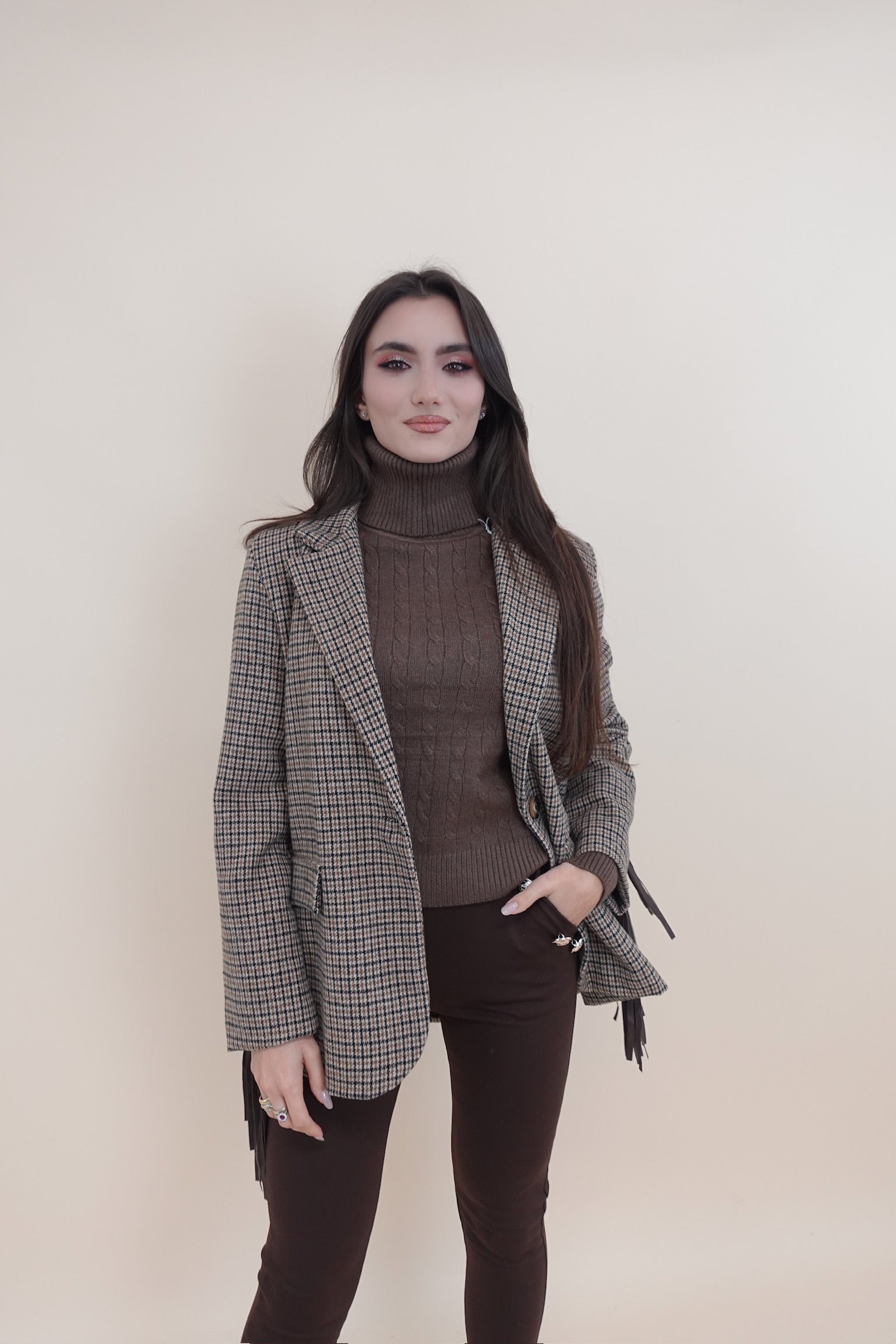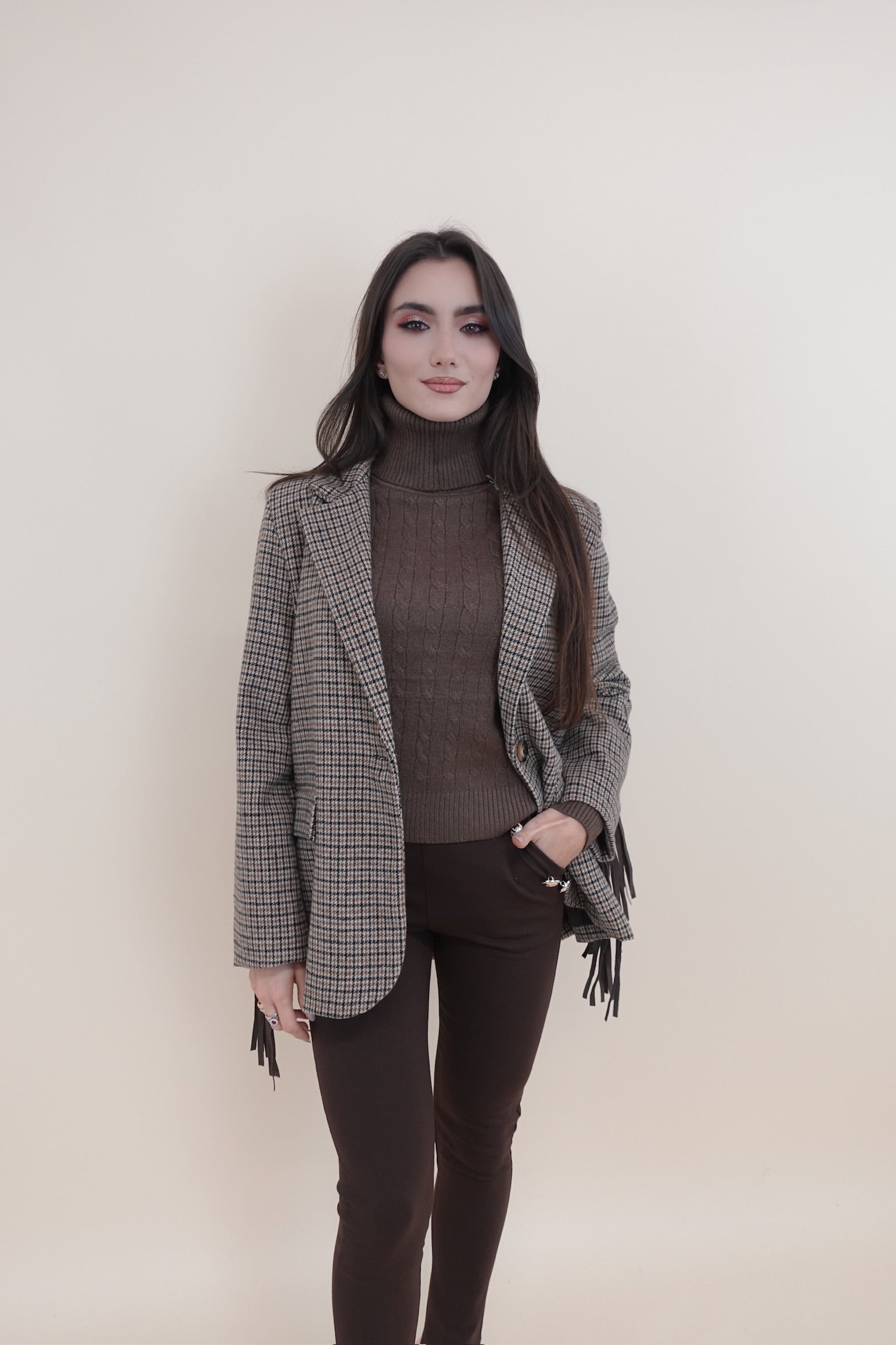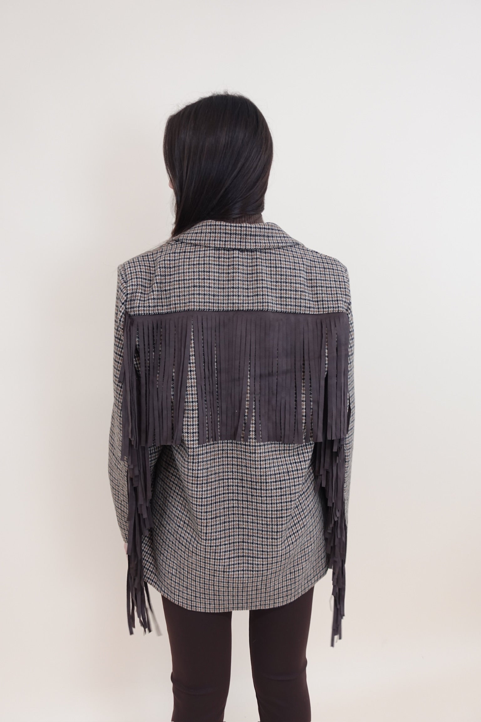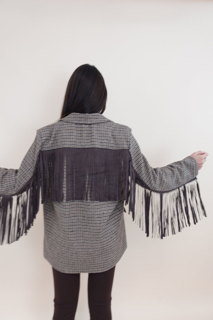 Giacca foderata in tessuto caldo con frange in similpelle sul retro e bottone sul davanti