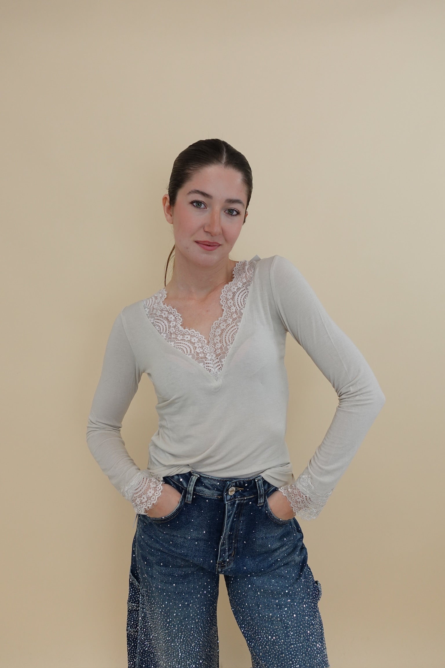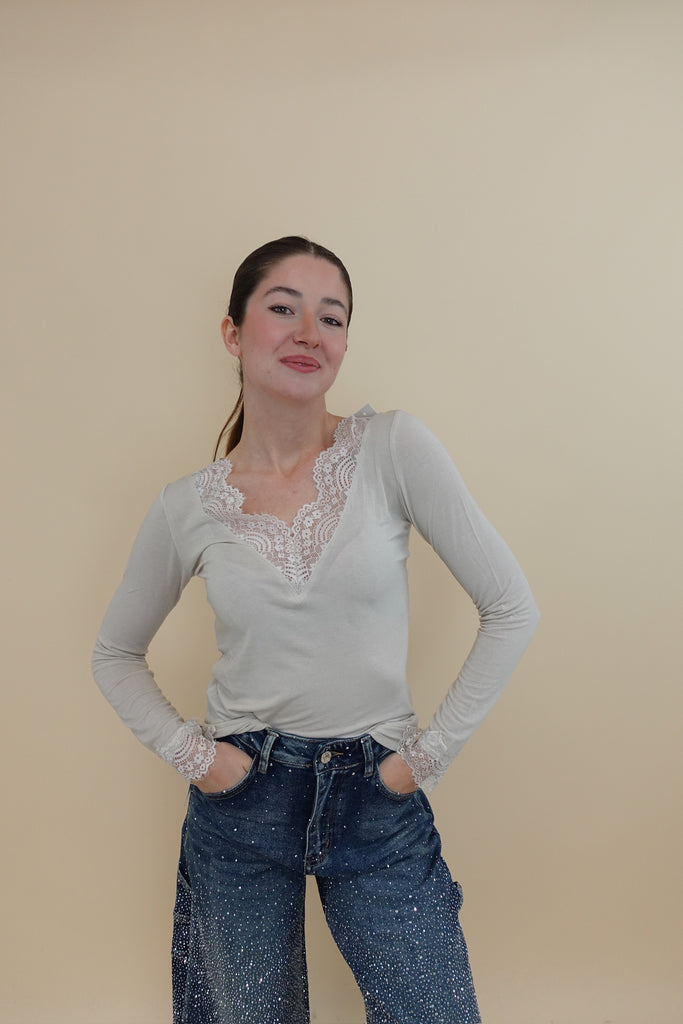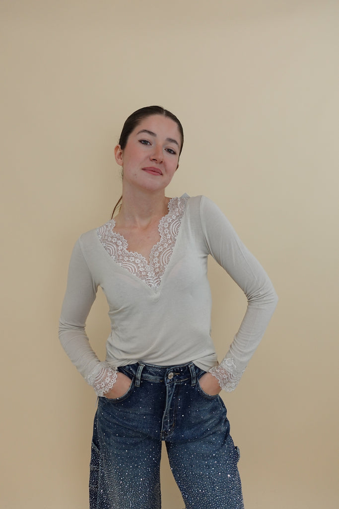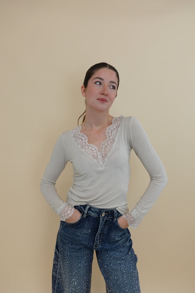 Maglia in misto cashmere con scollo a V in pizzo e pizzo sul polsino