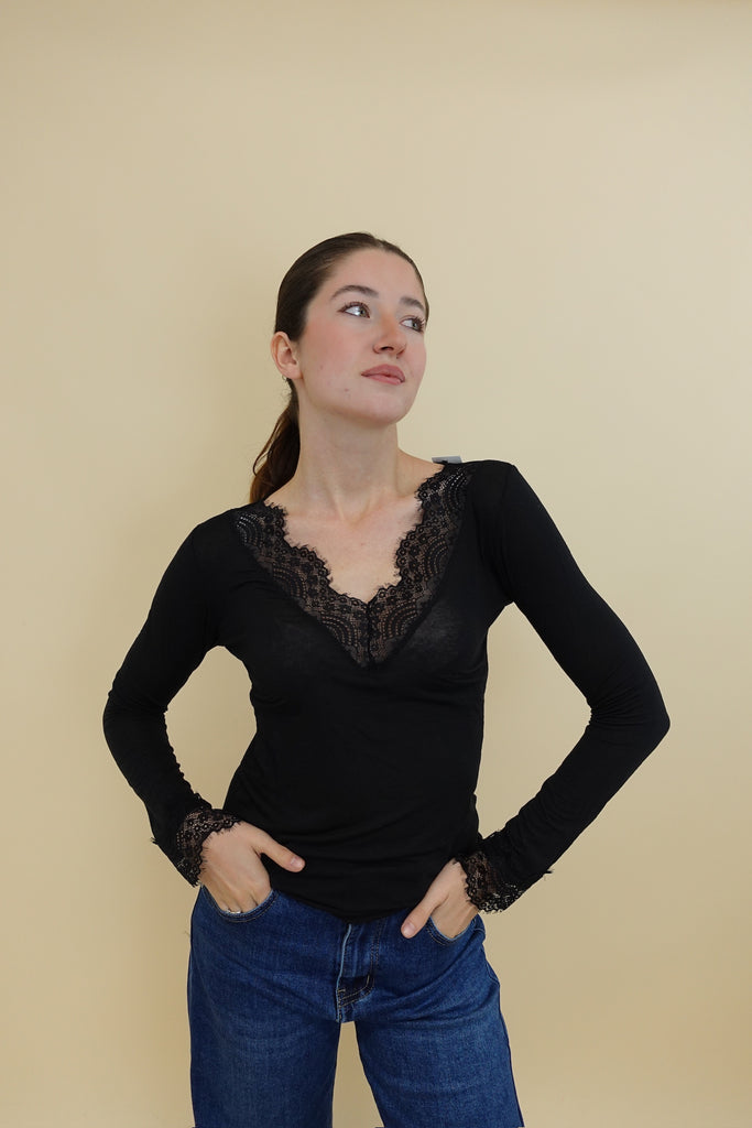 Maglia in misto cashmere con scollo a V in pizzo e pizzo sul polsino