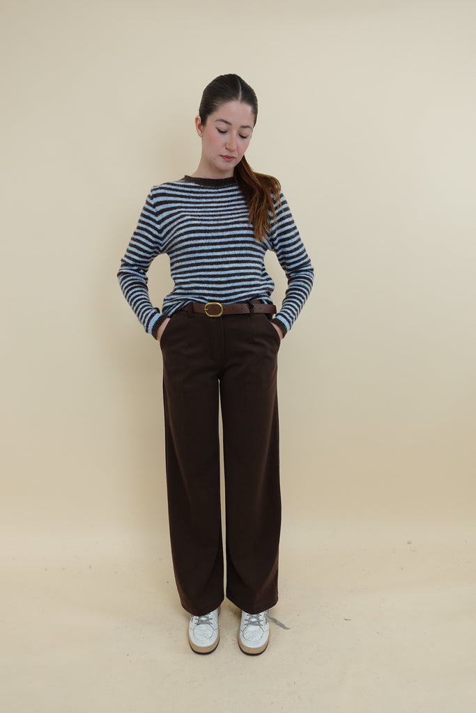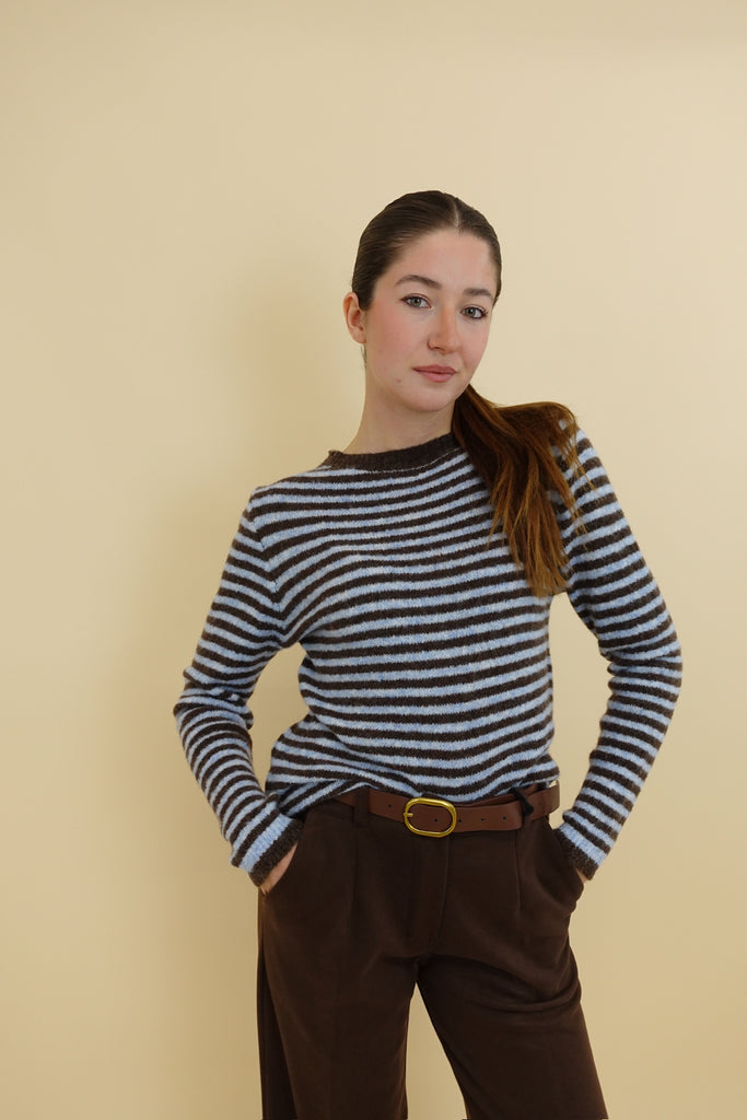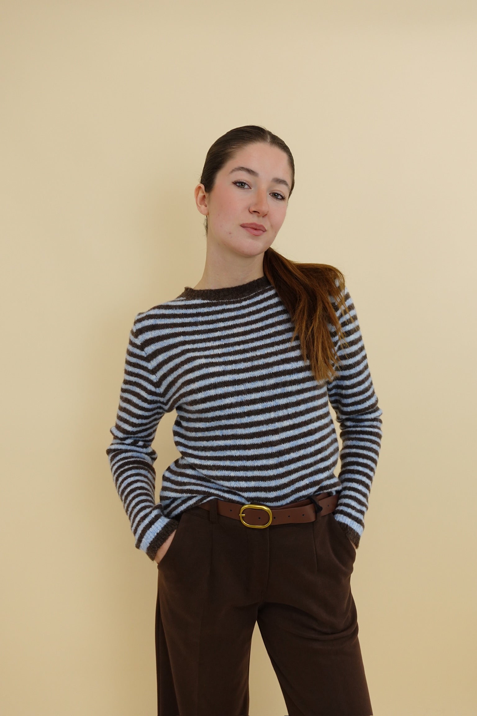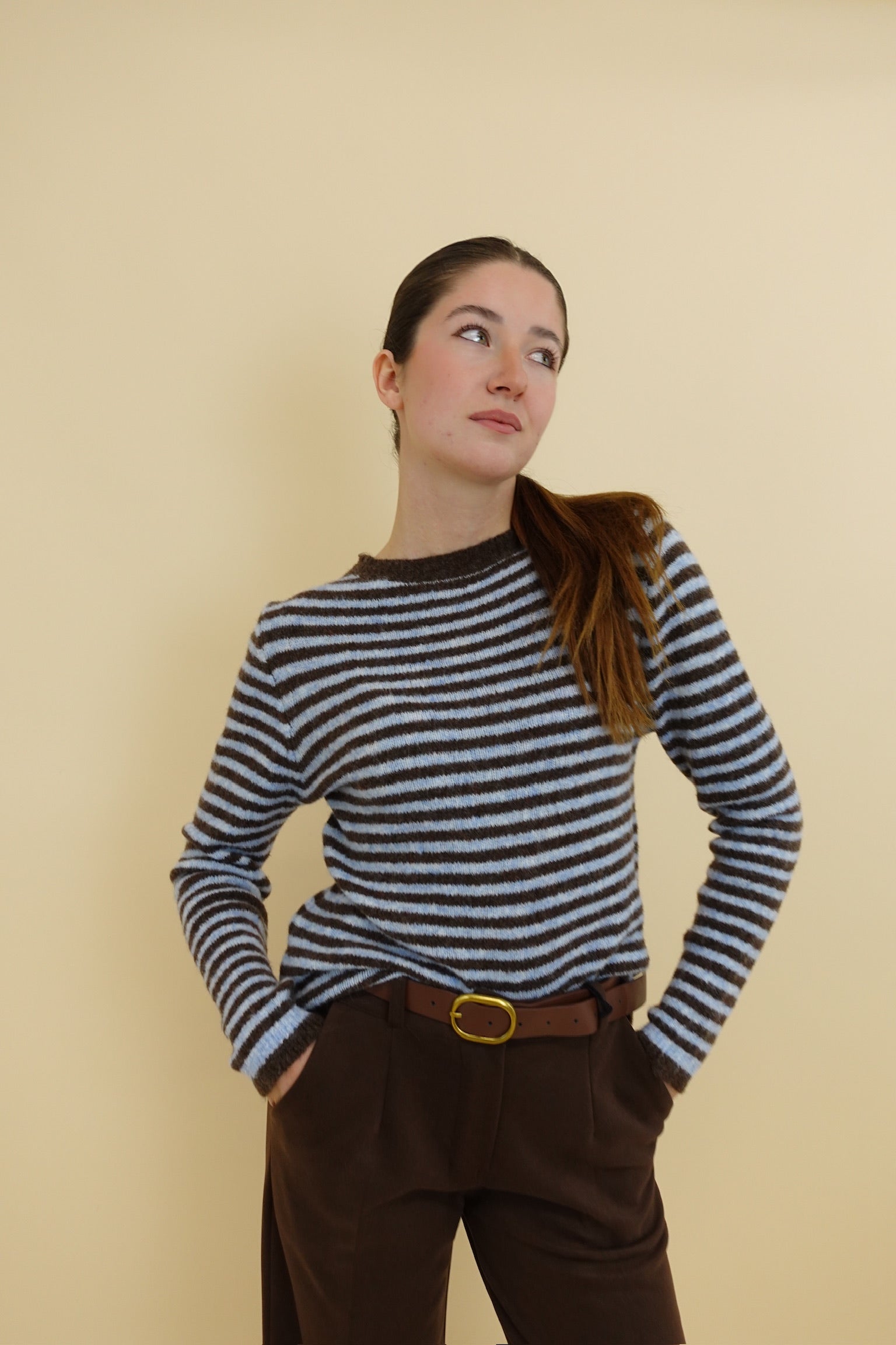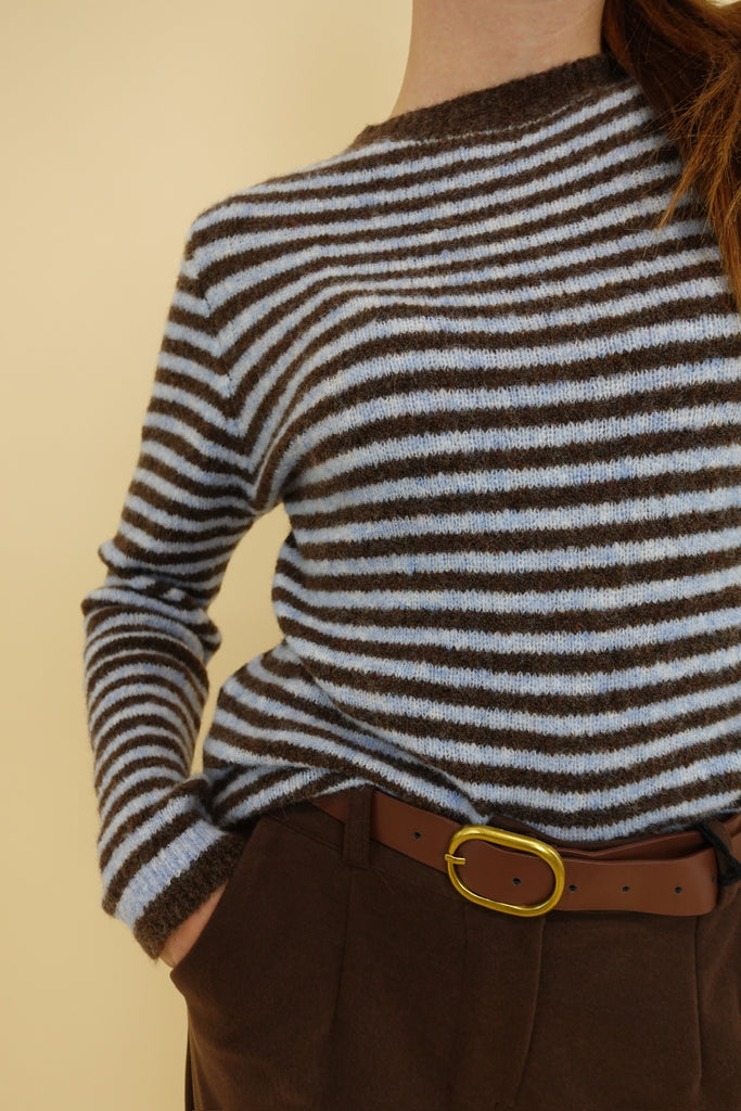 Maglione girocollo a righette sui toni dell'azzurro e marrone