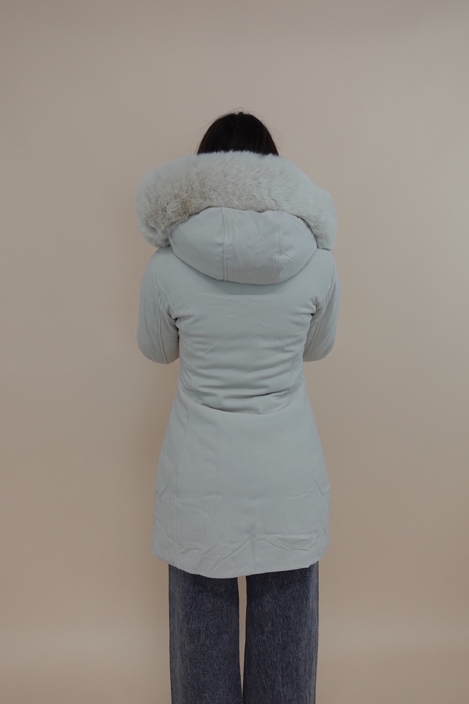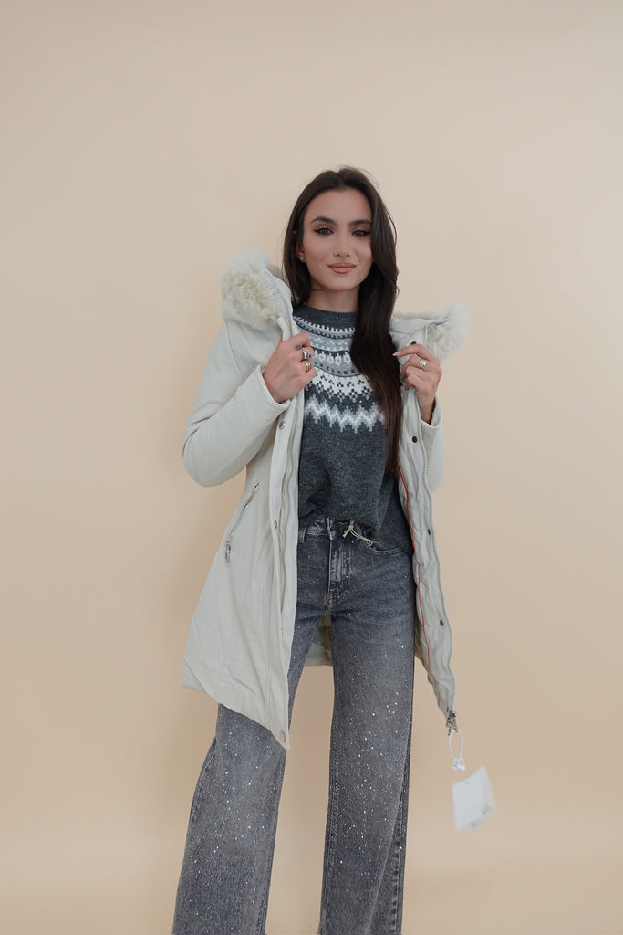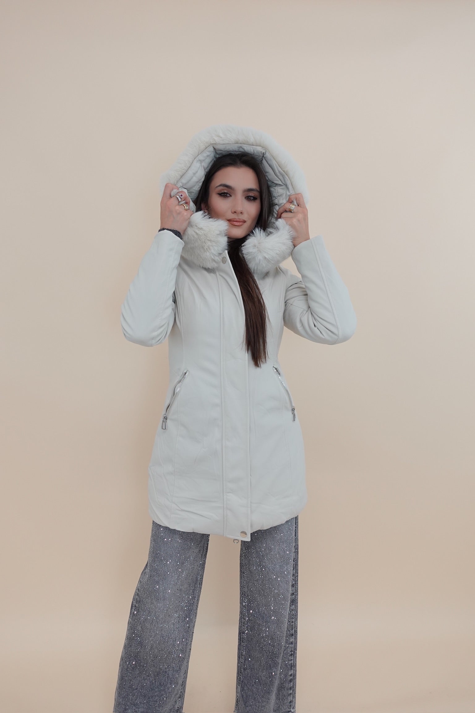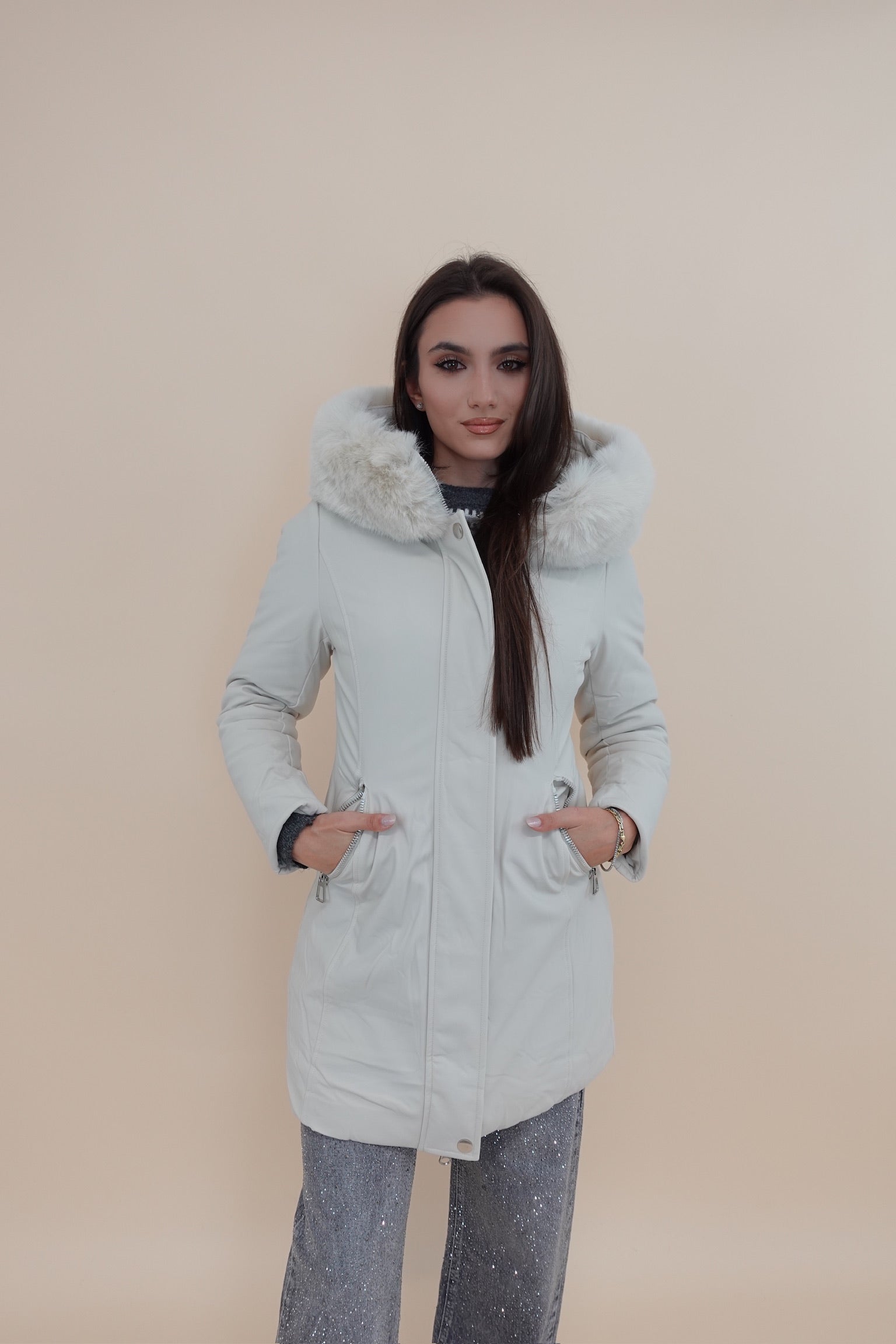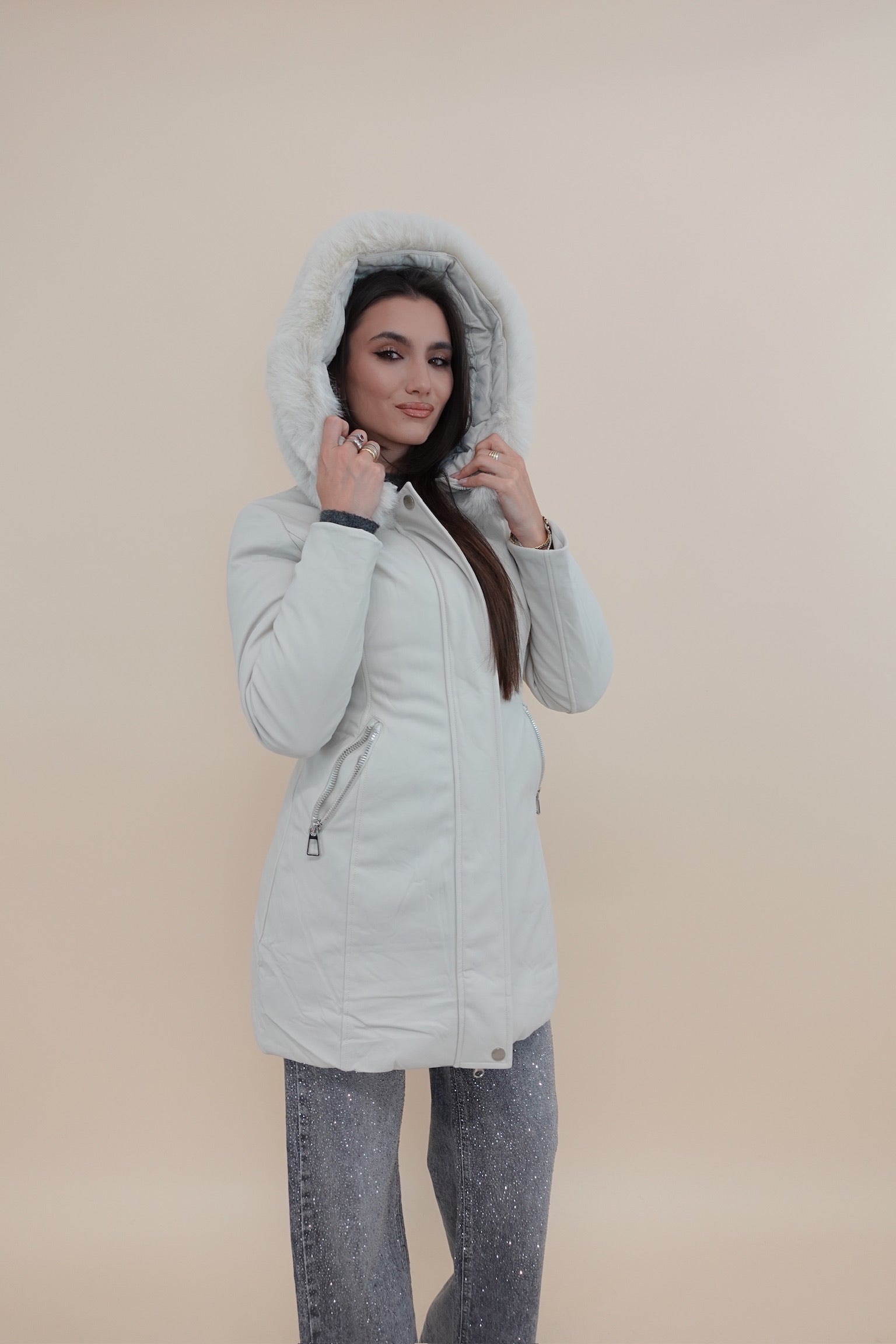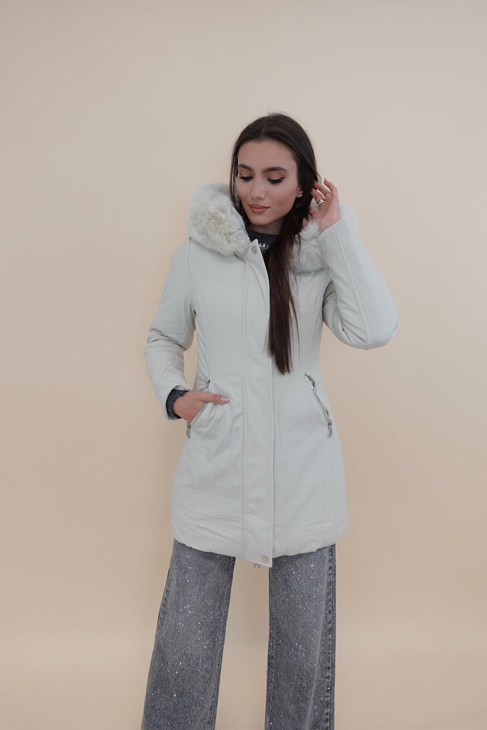 Piumino sfiancato con tasche laterali, cappuccio e chiusura con zip e bottoni