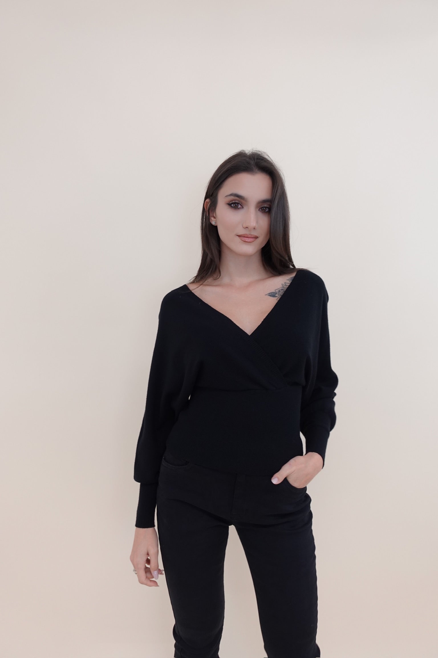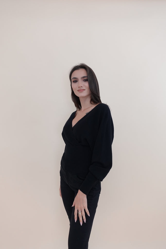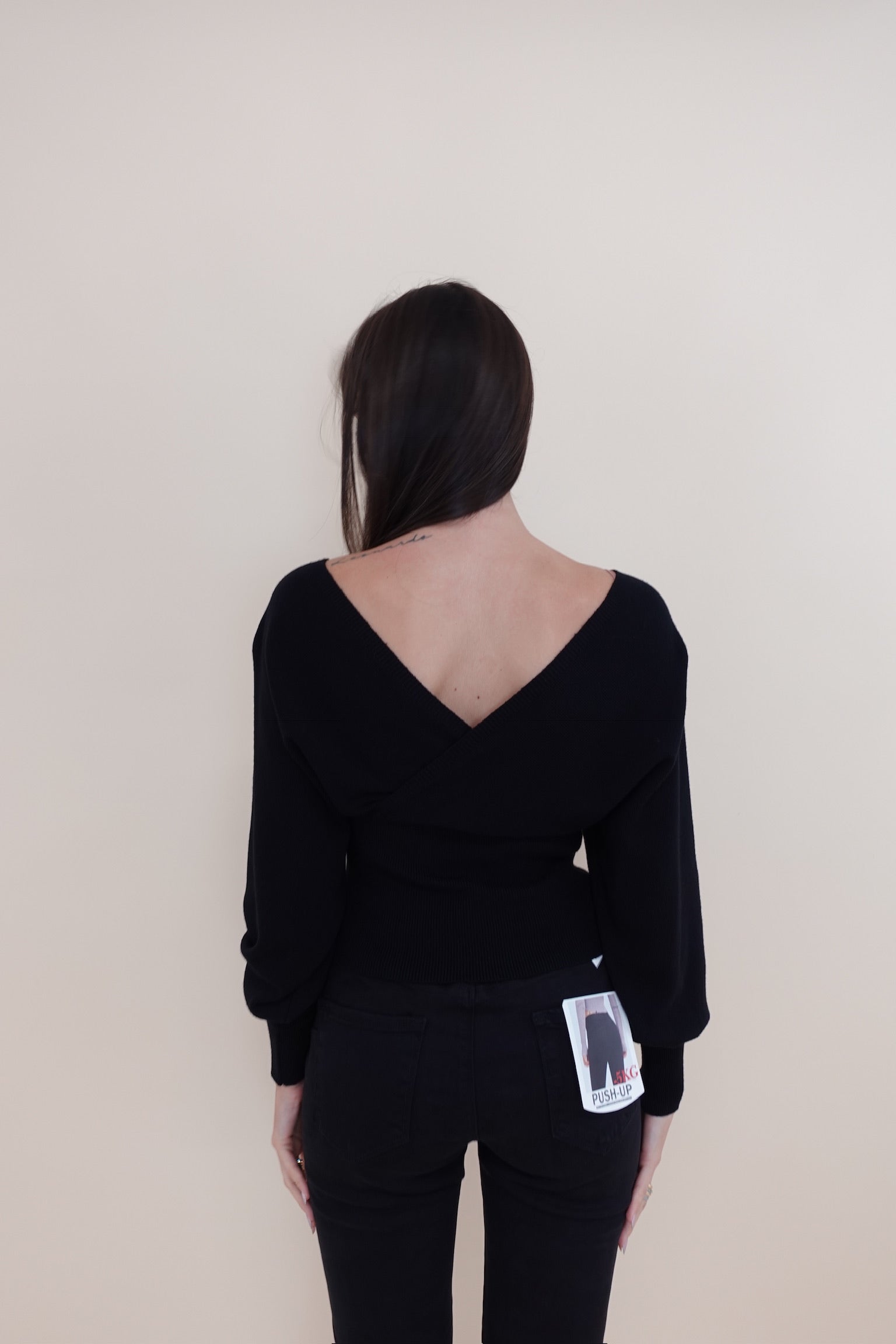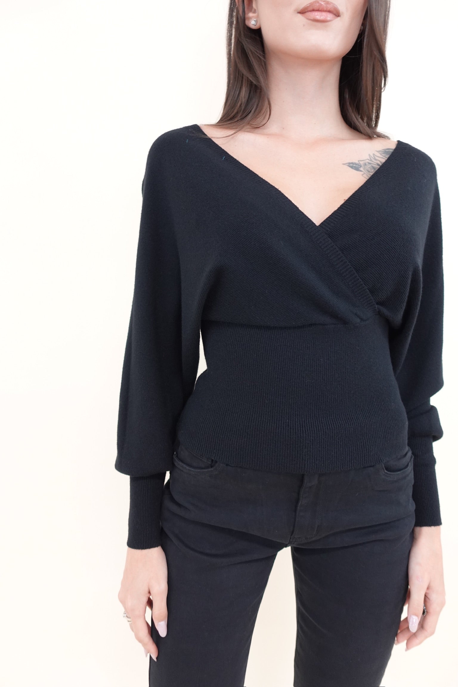 Pullover leggermente crop con scollo a V incrociato sia sul davanti sia sul retro