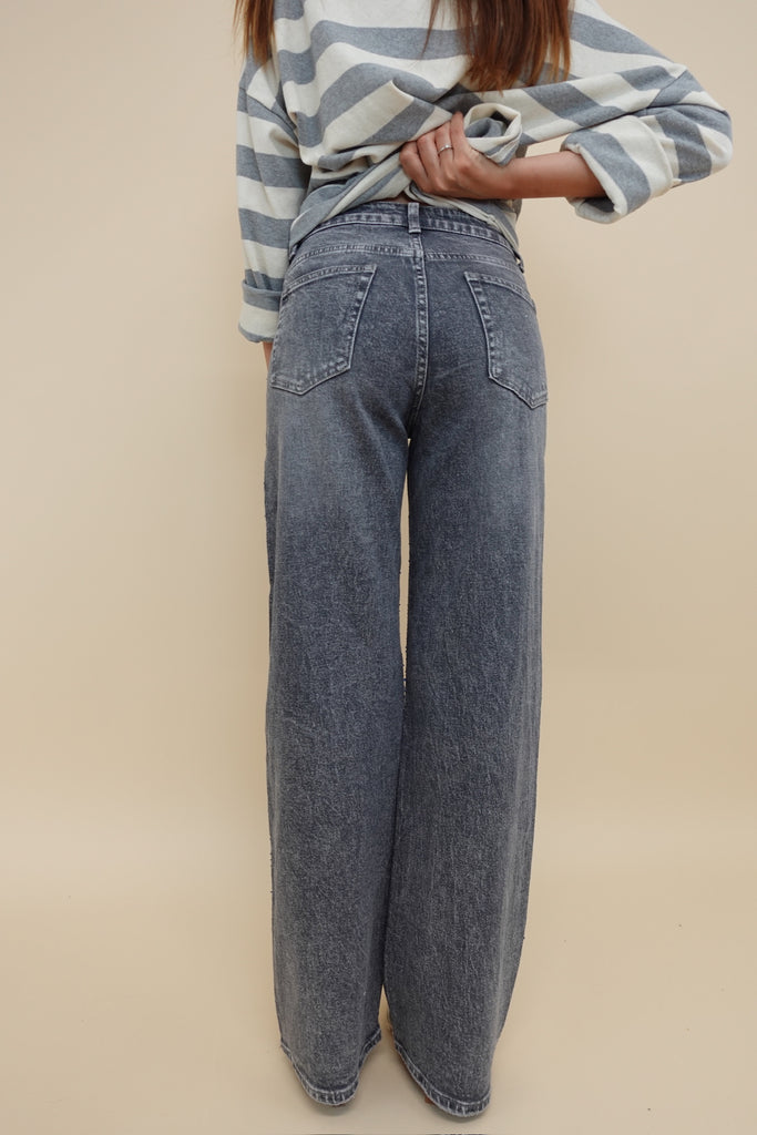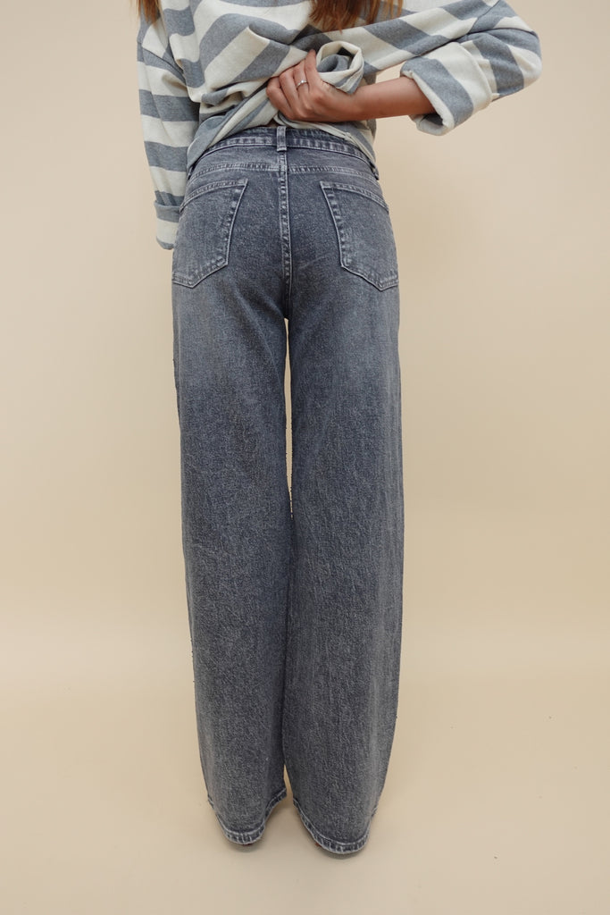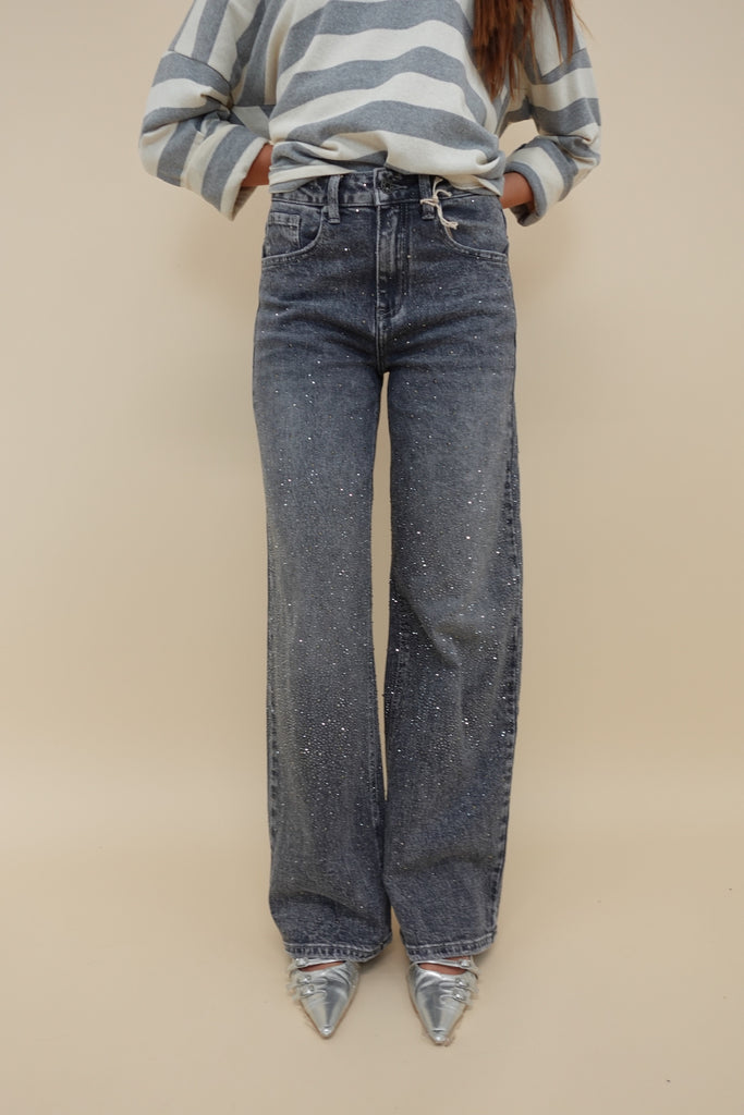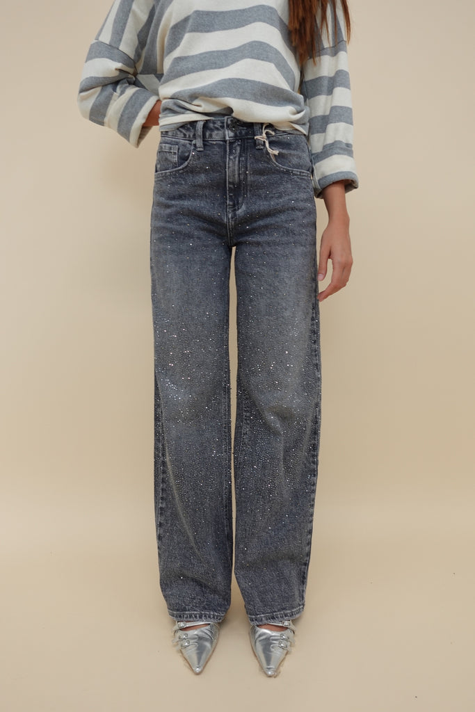 Jeans a palazzo a vita alta con brillantini sulla parte davanti