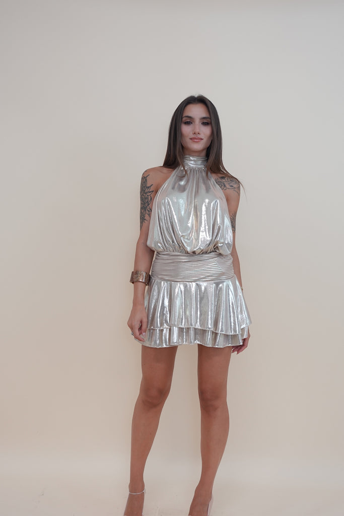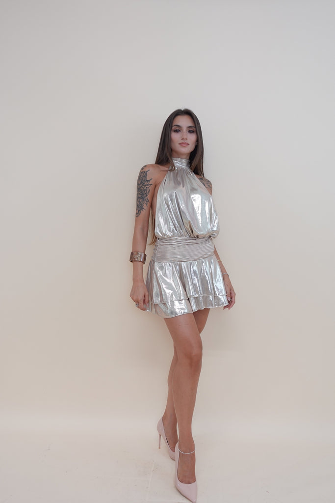 Abito lucido con elastico in vita e schiena scoperta