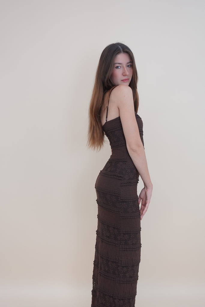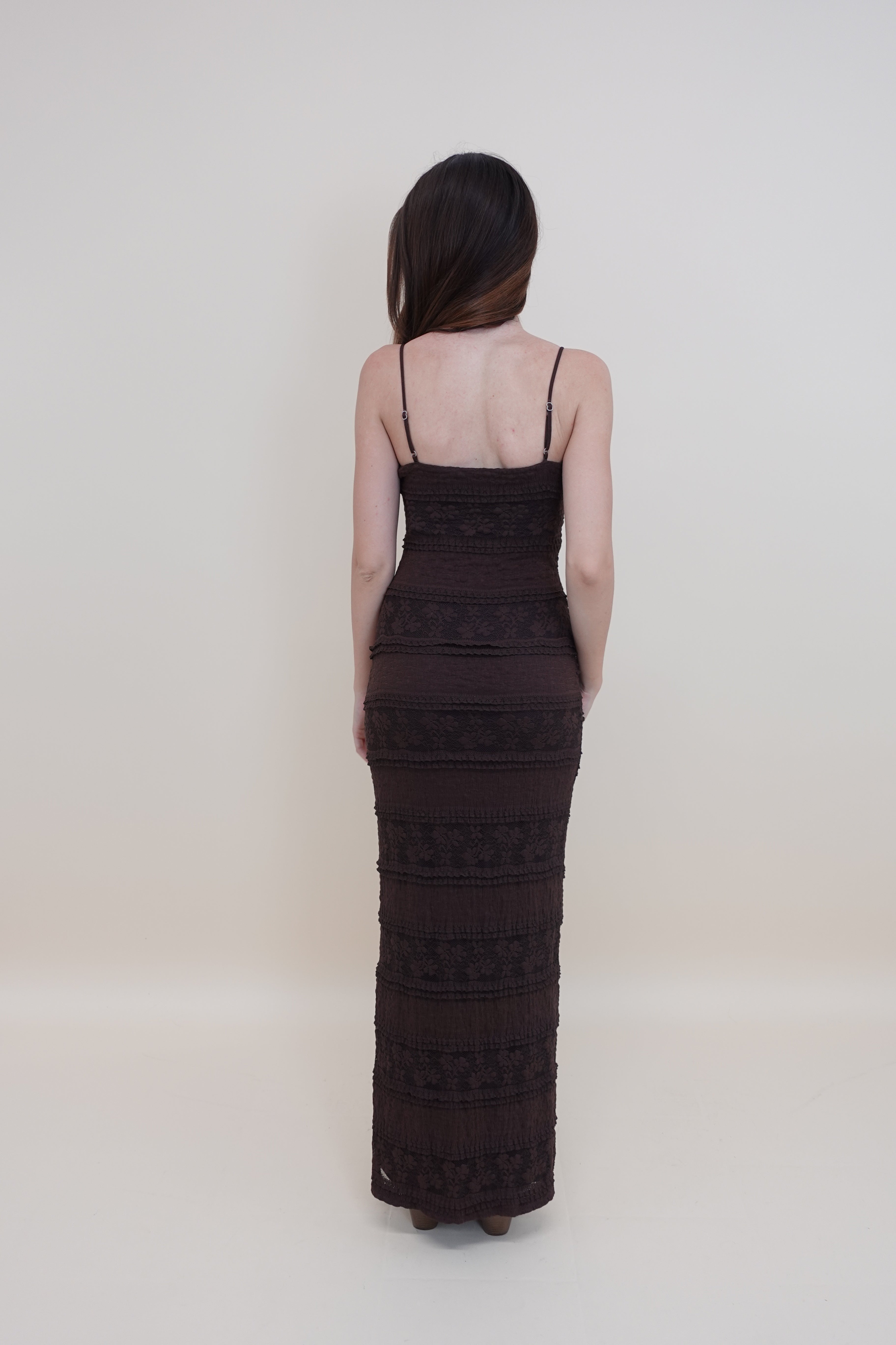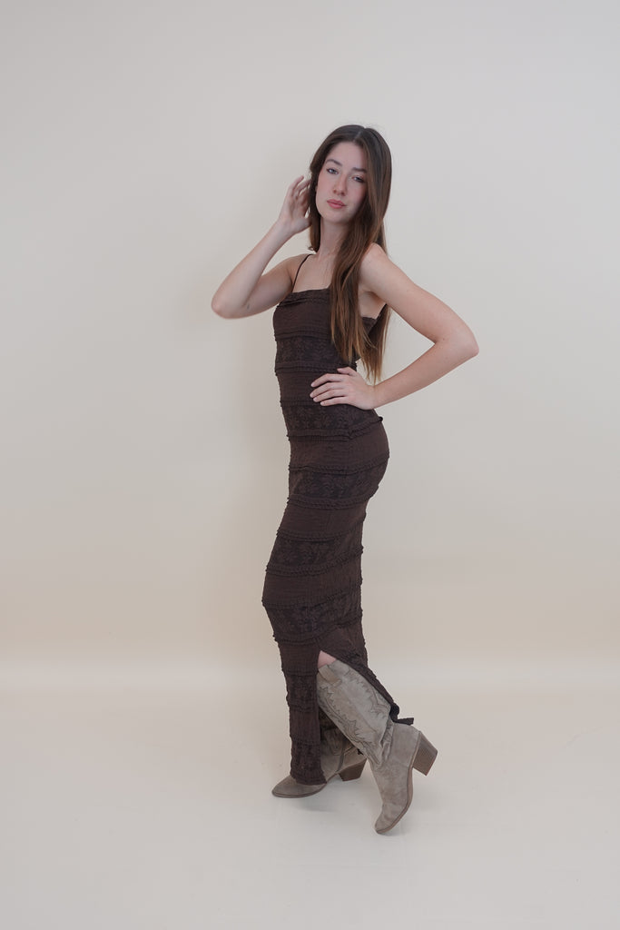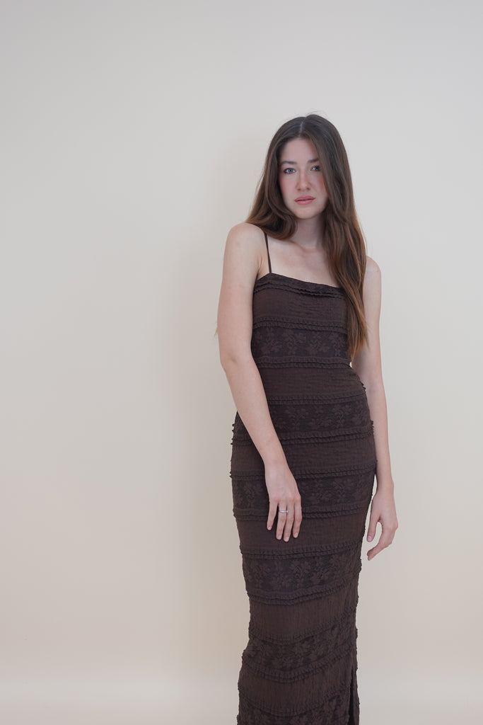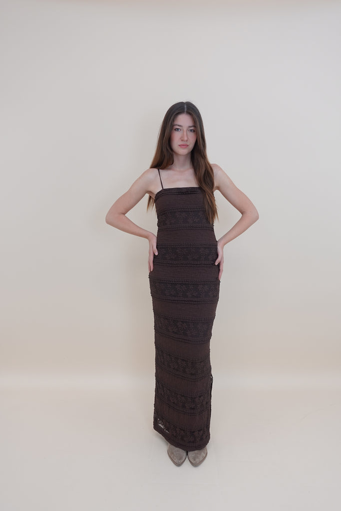 Abito a tubino elasticizzato, a fascia con spalline fine, in effetto pizzo con sottoveste