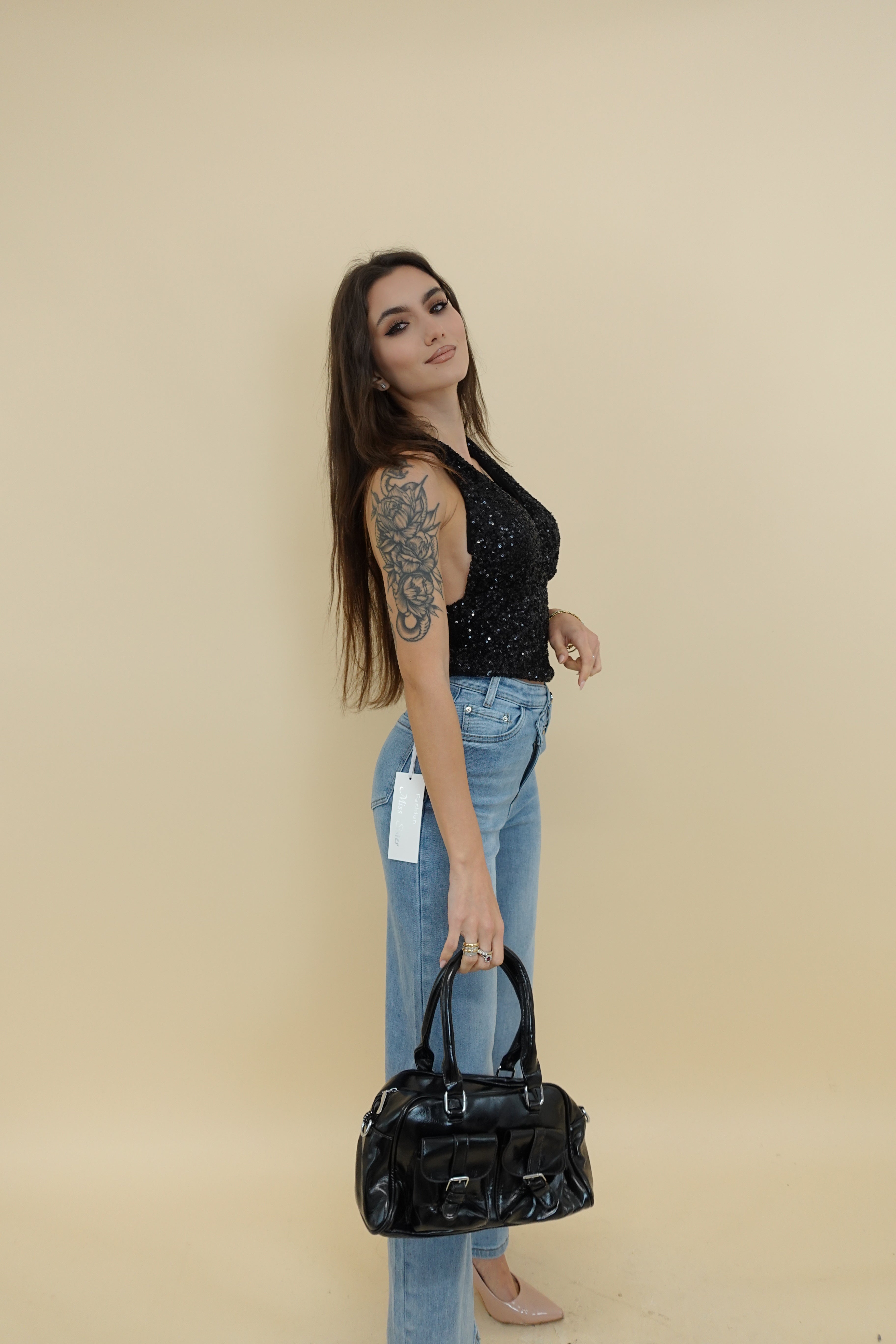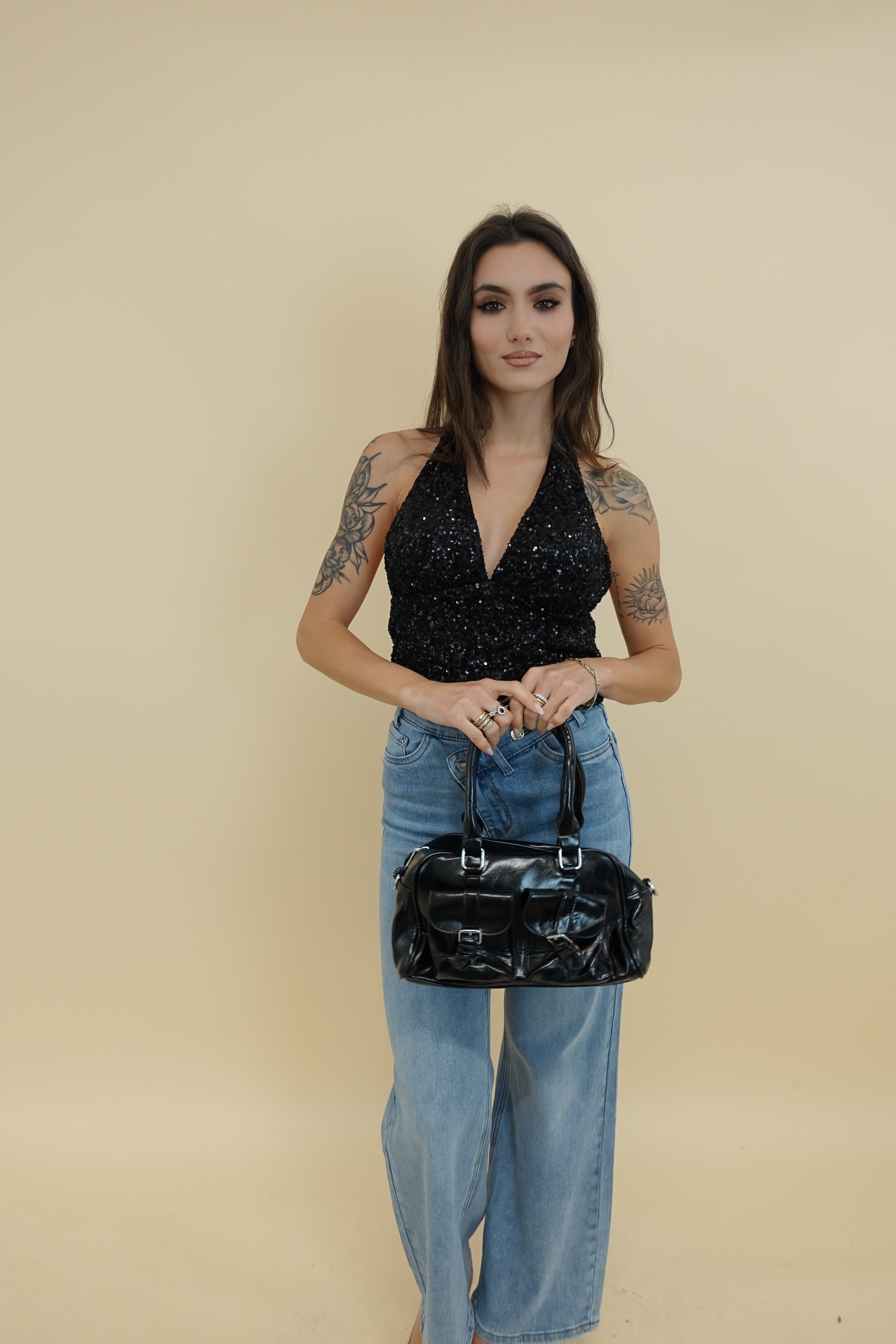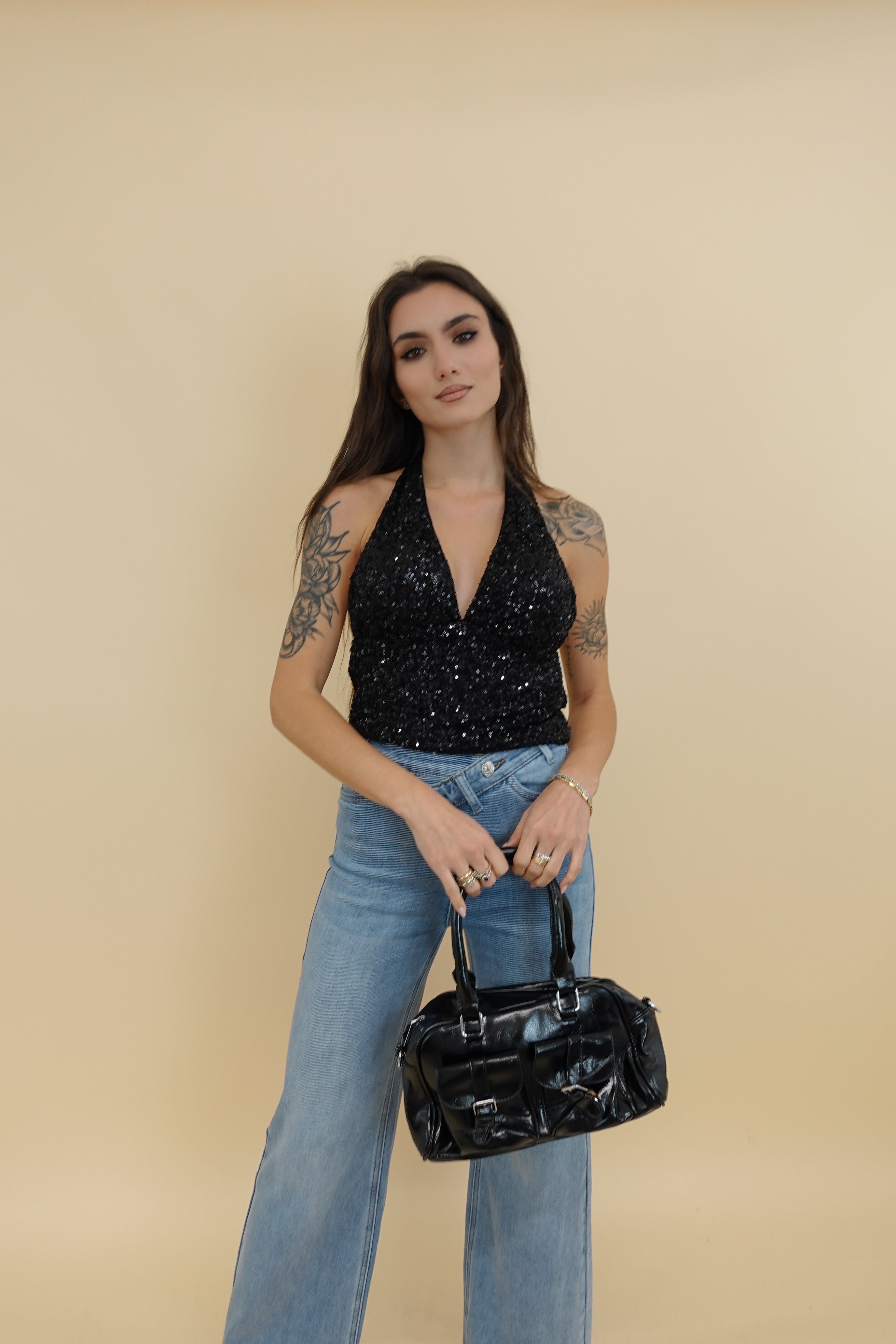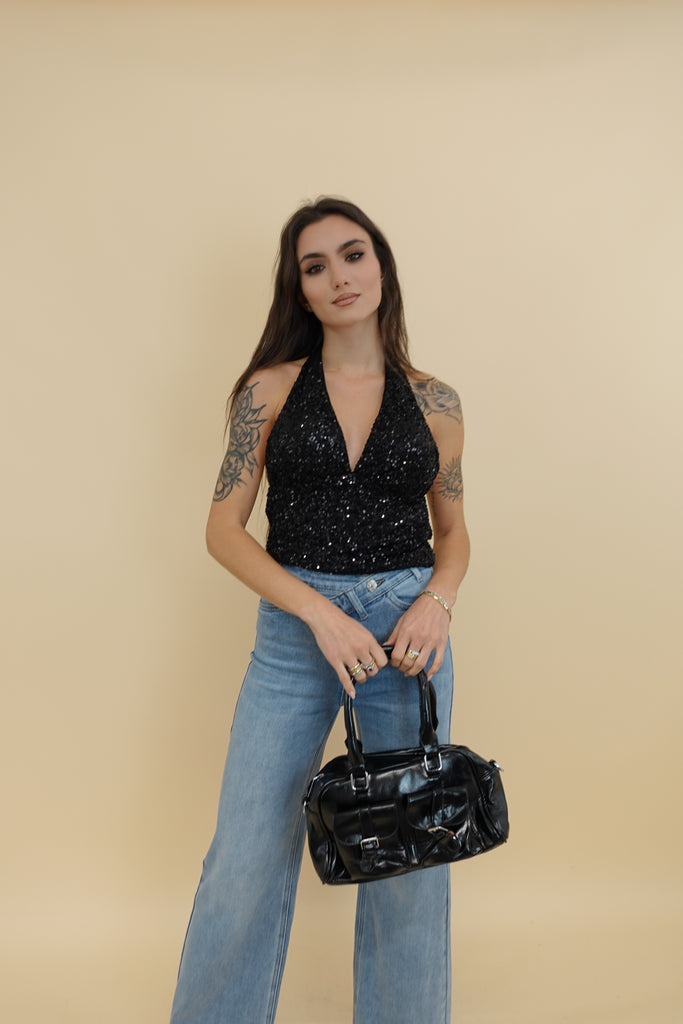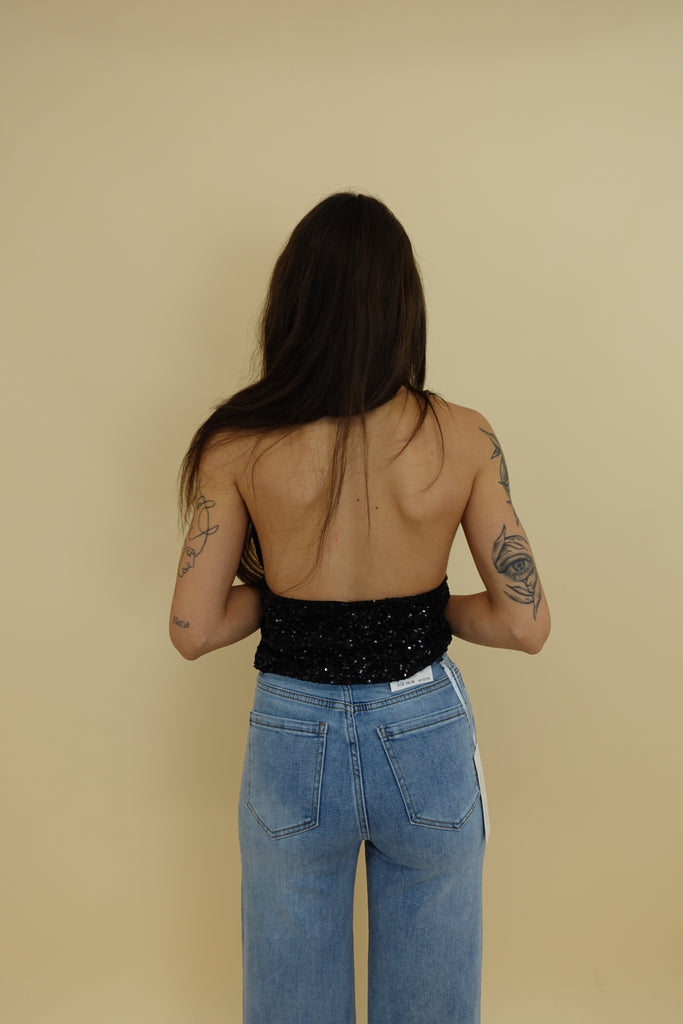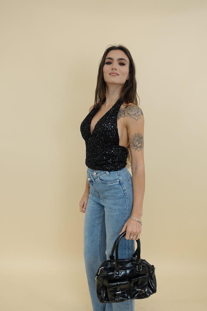 top con paiettes, allacciatura dietro al collo, coppe preformate